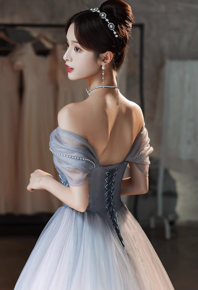Elegant Tulle Hem Off-Shoulder Glitter Beading Evening Gowns A-line Prom Long Dress AP0644
