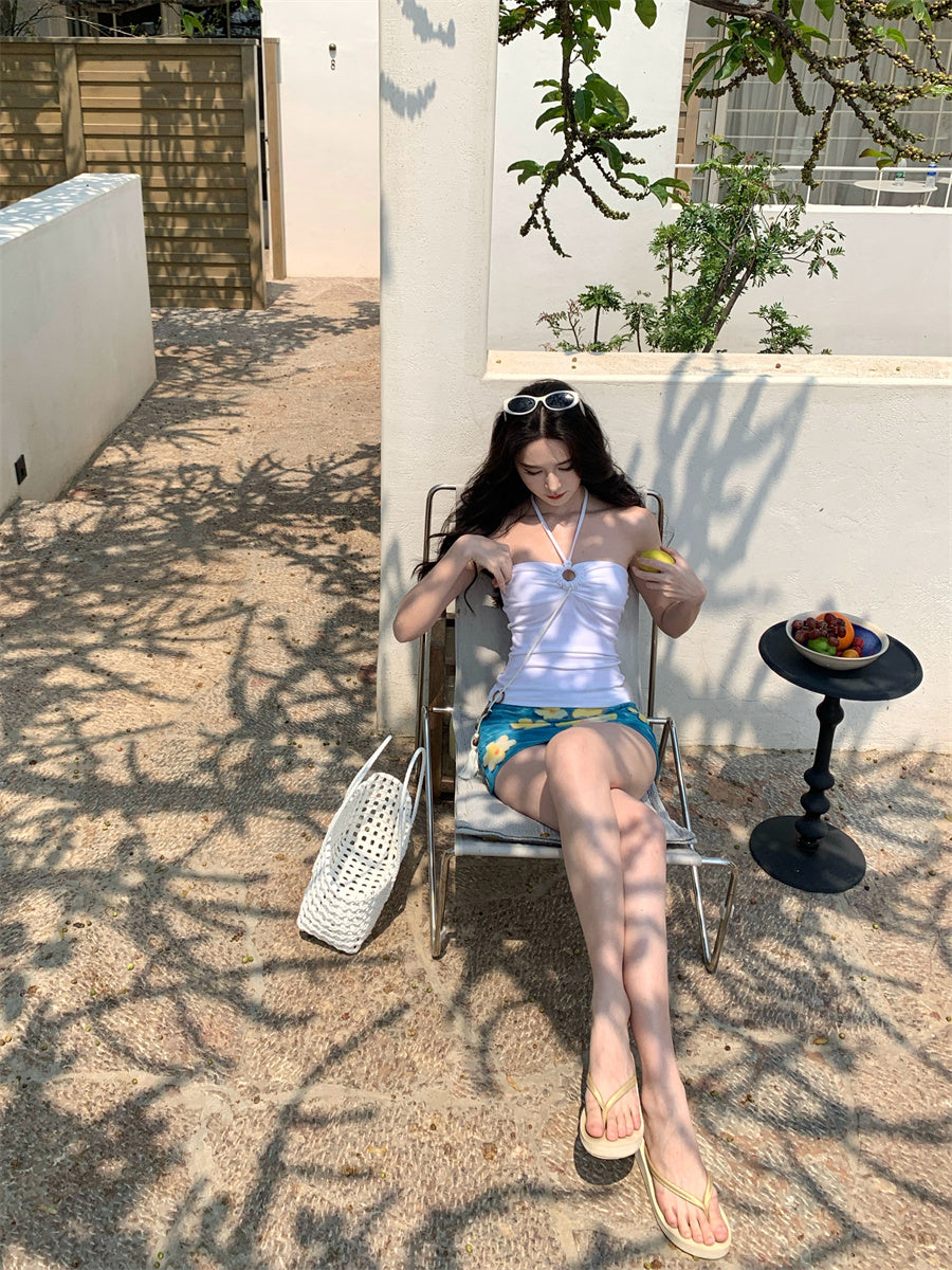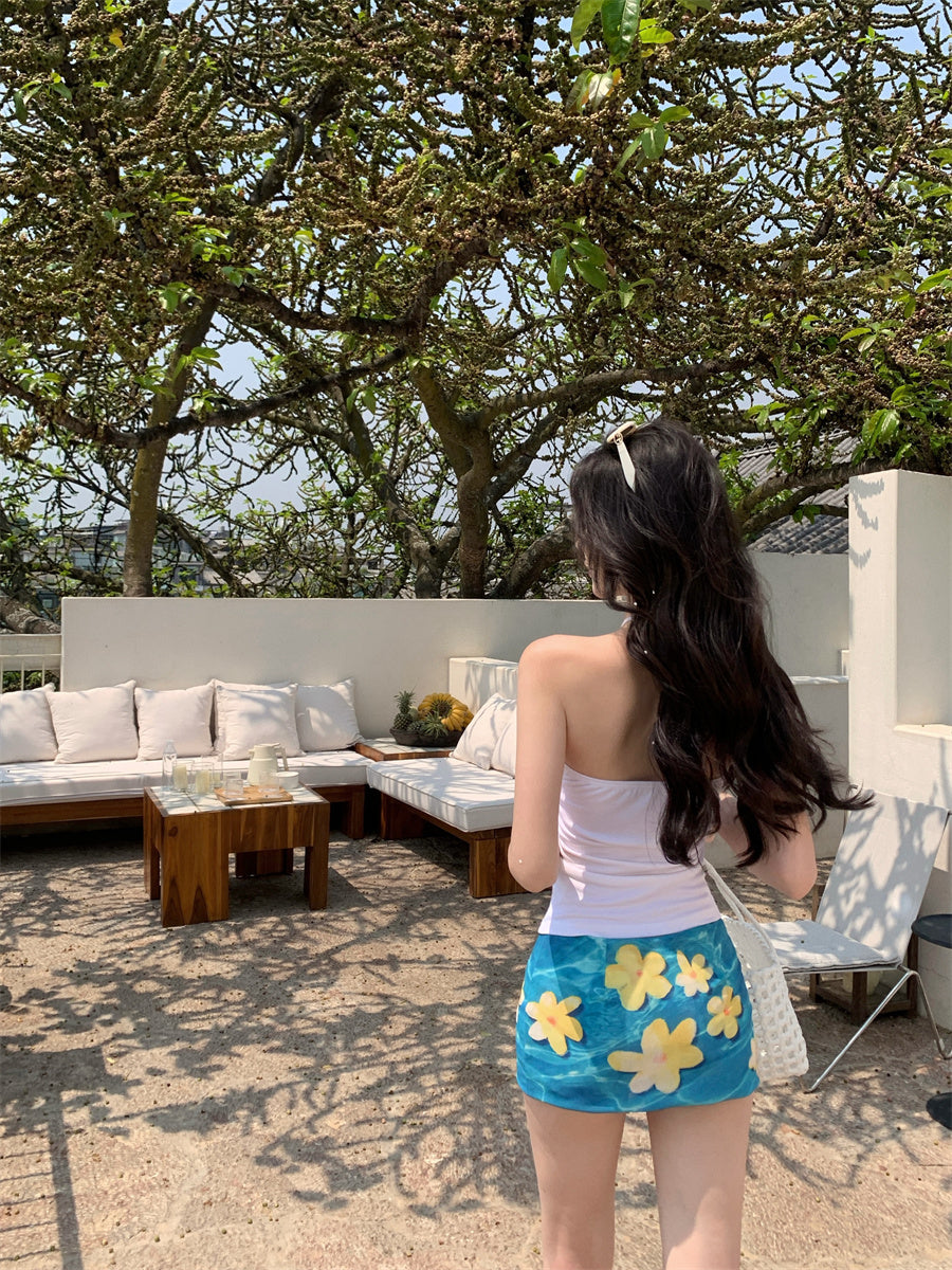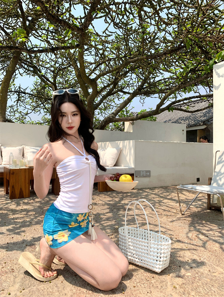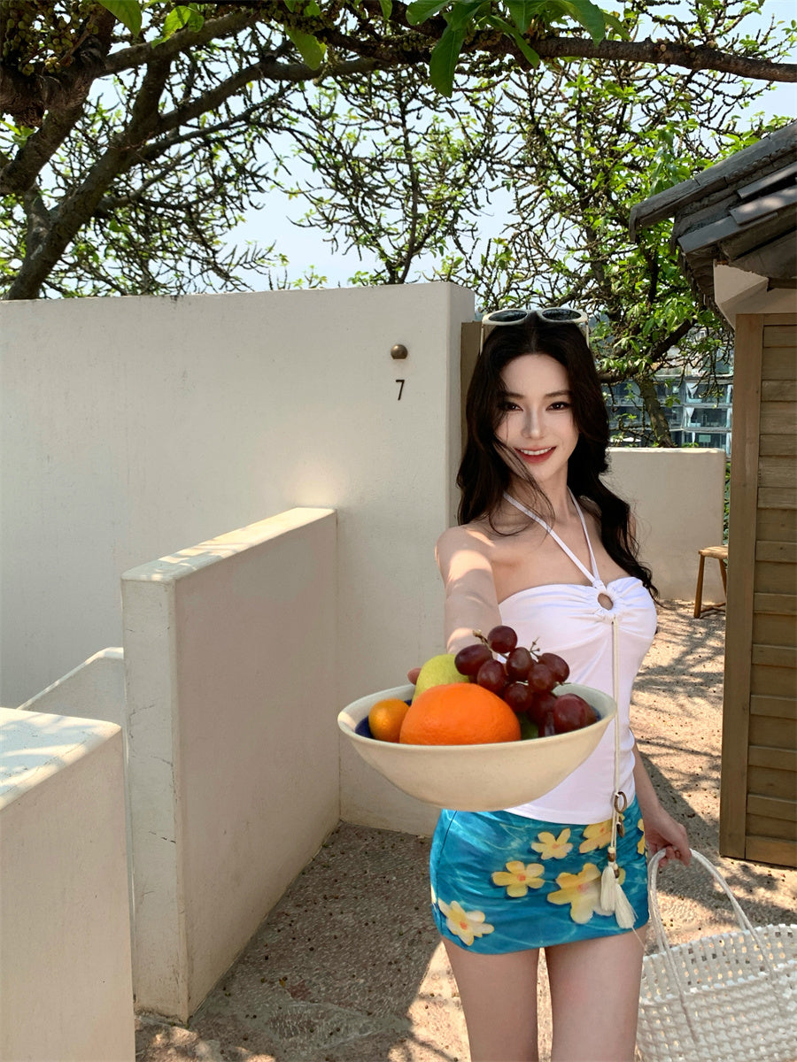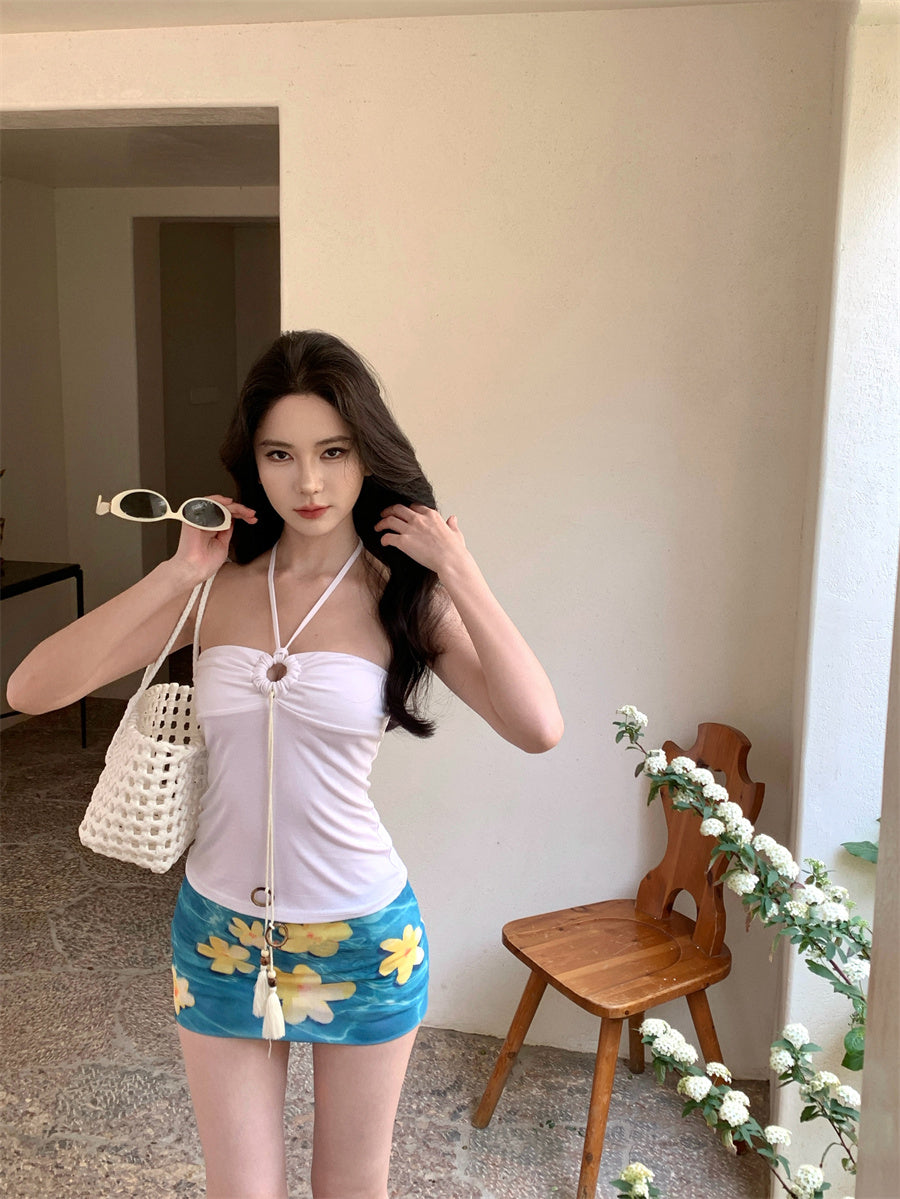 Hot Girls 2-Piece Set Sheath Mini Skirt Retro Floral Print Cutout Halter Short Dress AP3414