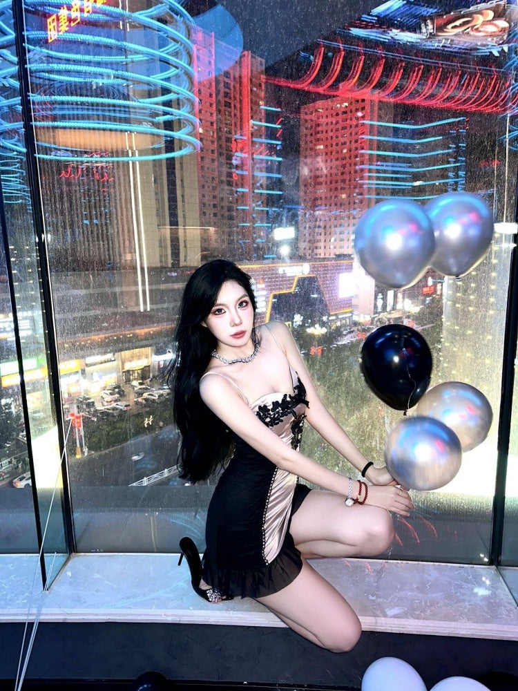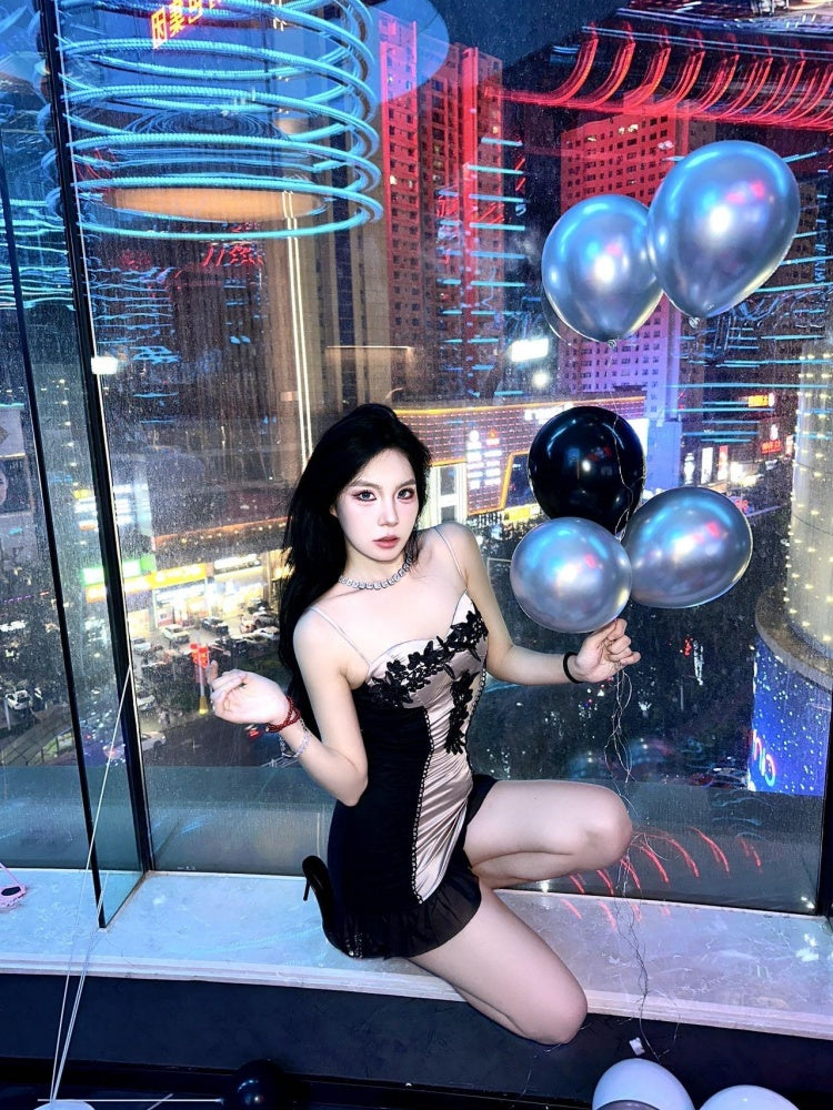Novelty Spaghetti Strap Floral Ruffles Trim Mini Skirt Sexy Bodycon Birthday Party Short Dress AP4041