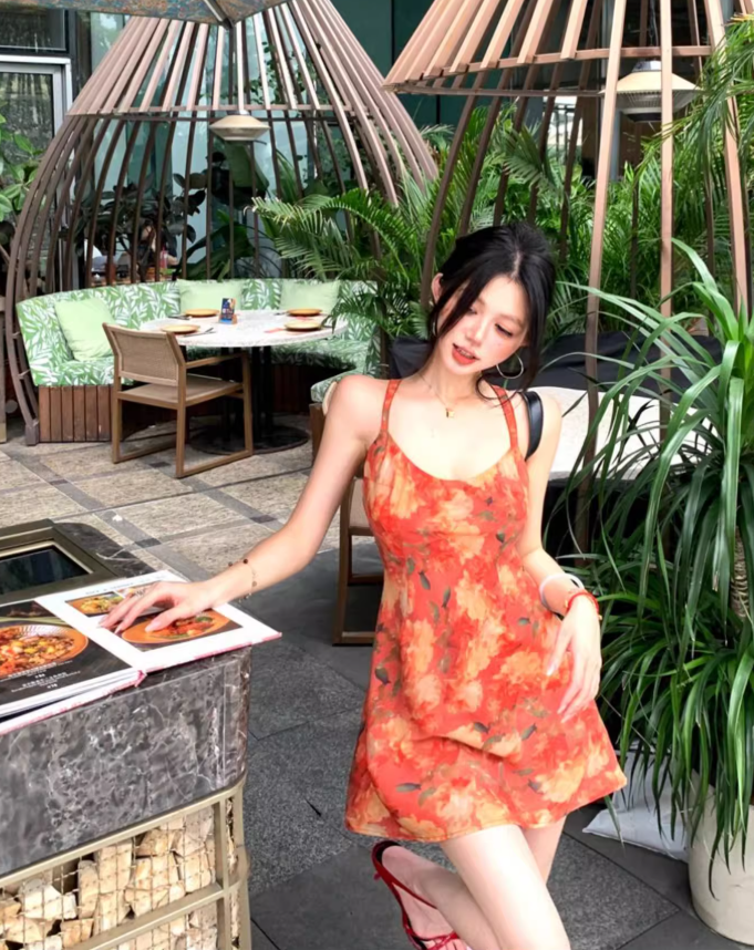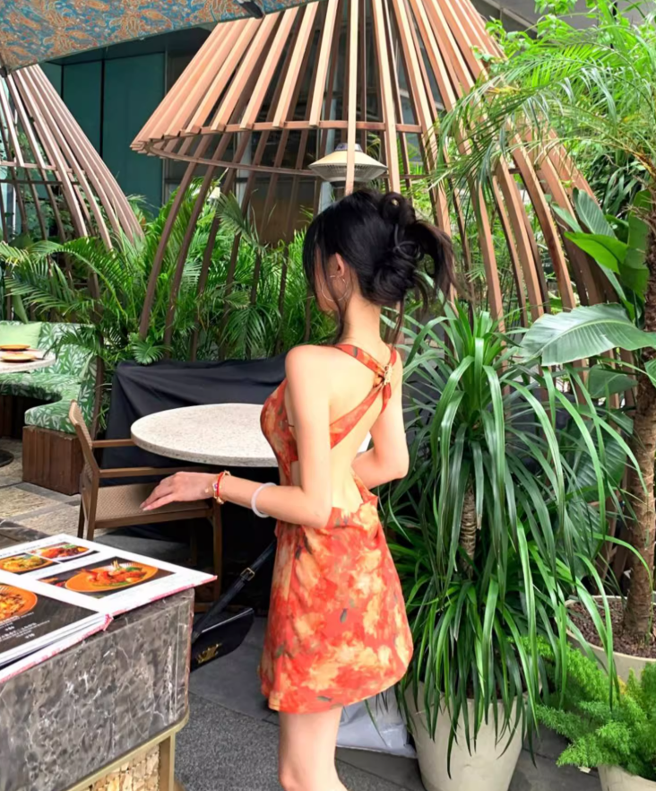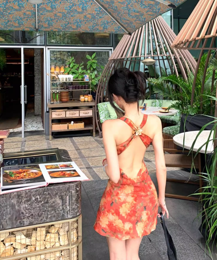 Vintage Backless Floral Print A-Line Skirt Vibrant Fitting Halter Short Dress AP0616
