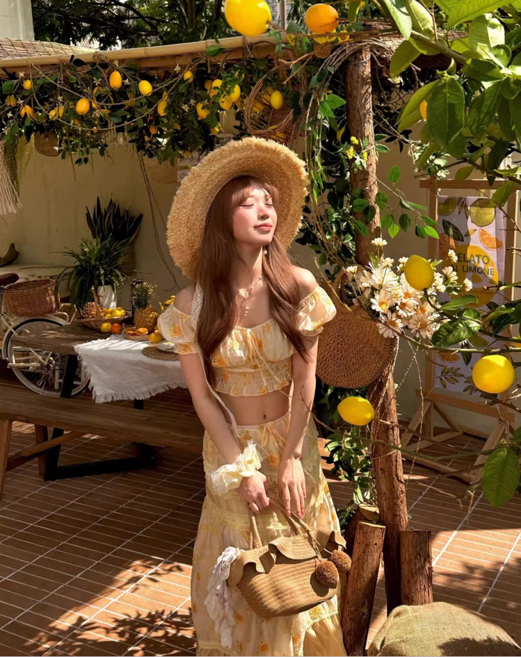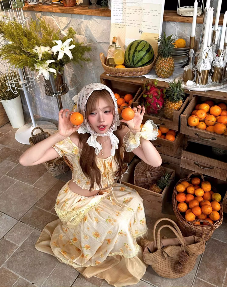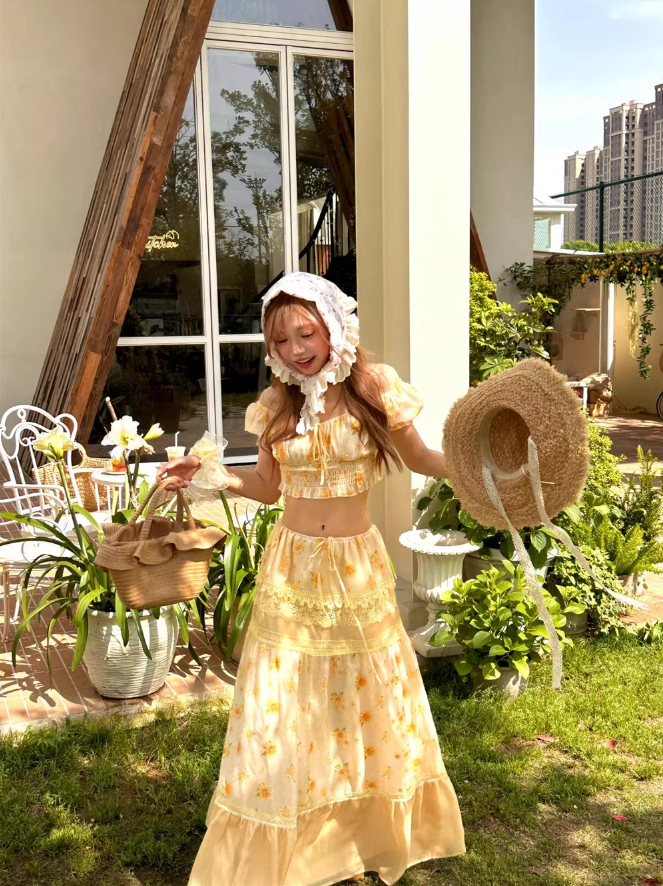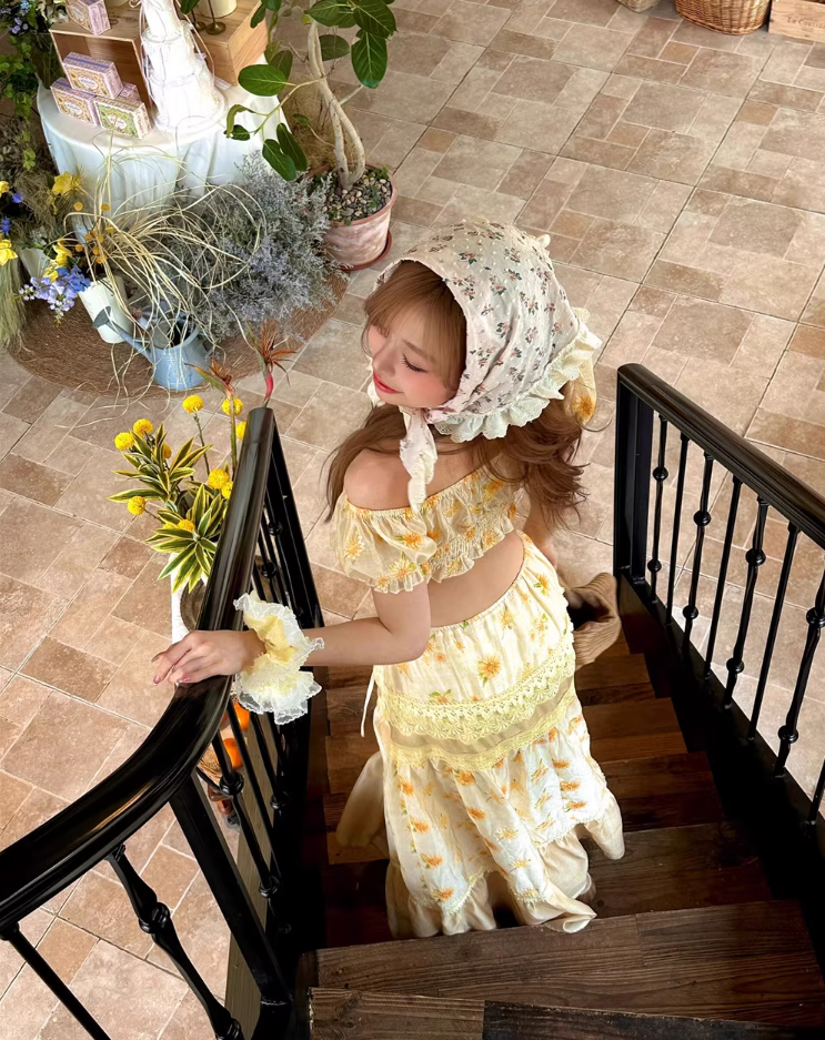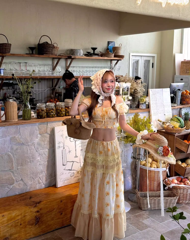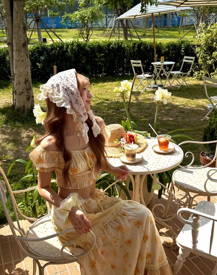 Cottagecore Off-Shoulder Floral Two-Piece Long Dress Open-Waist Tiered Lace Long Dress AP1093