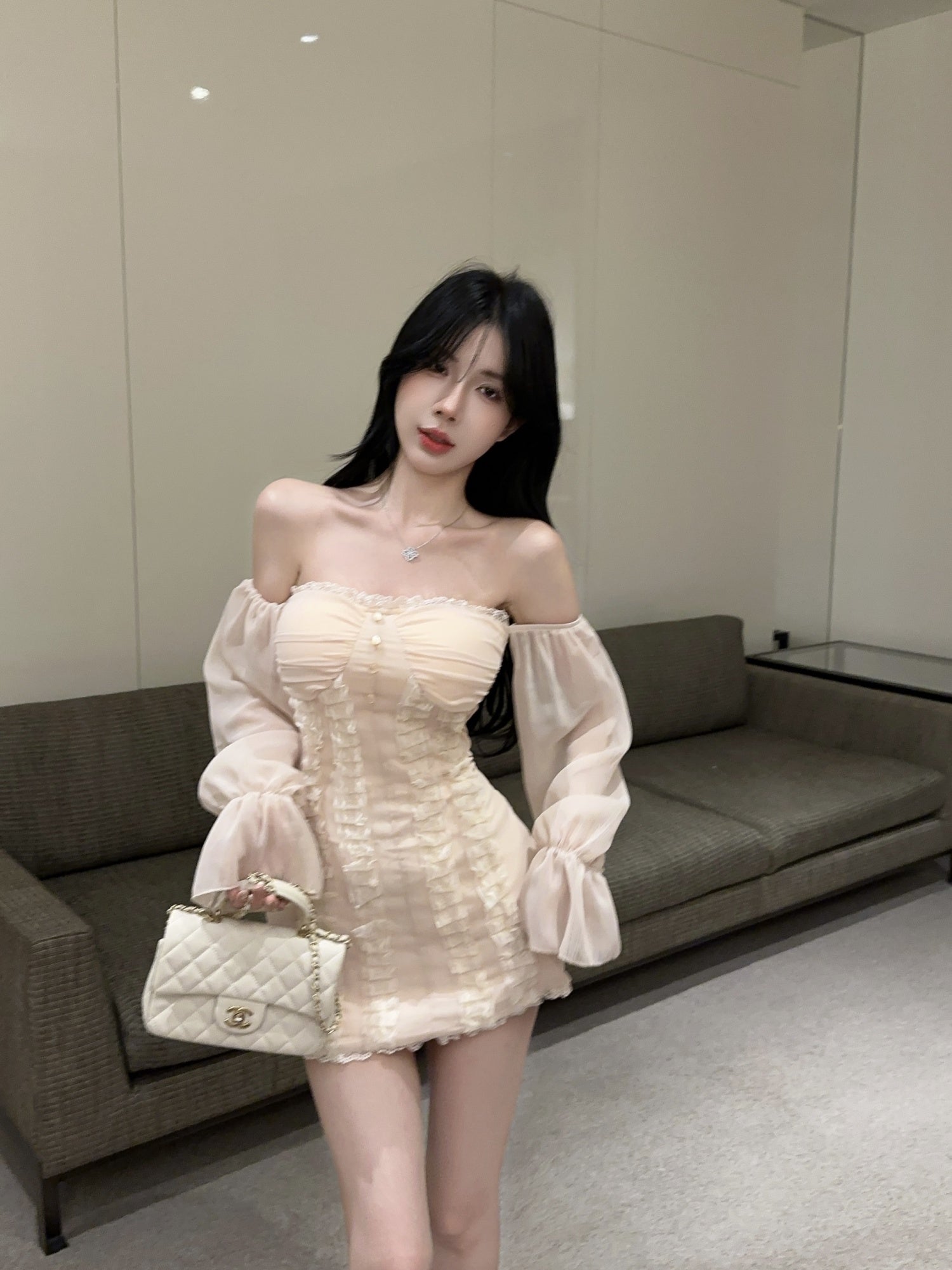 New Tendency Off-Shoulder Sheer Long Sleeve Mini Skirt Elegant Lace Ruffles Trimmed Pearl Buttons Short Dress AP1712