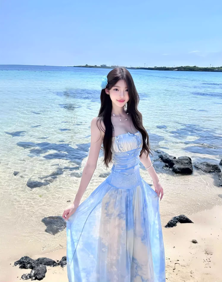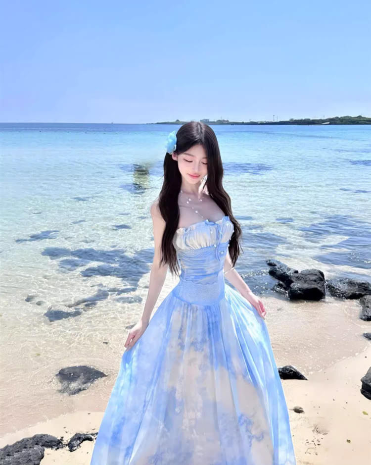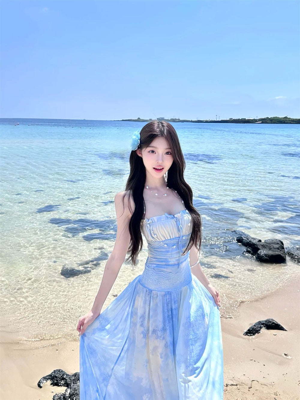 Charming Sheer-Inset Tie-Dye Maxi Dress Casual Draped Flowy Backless Halter Long Dress AP1174