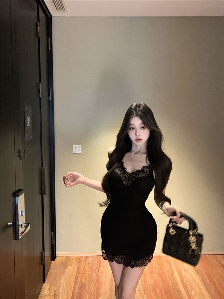 Summer Alluring Lace Edge Skirt Close-Fitting V Neck Spaghetti Strap Short Dress AP0309