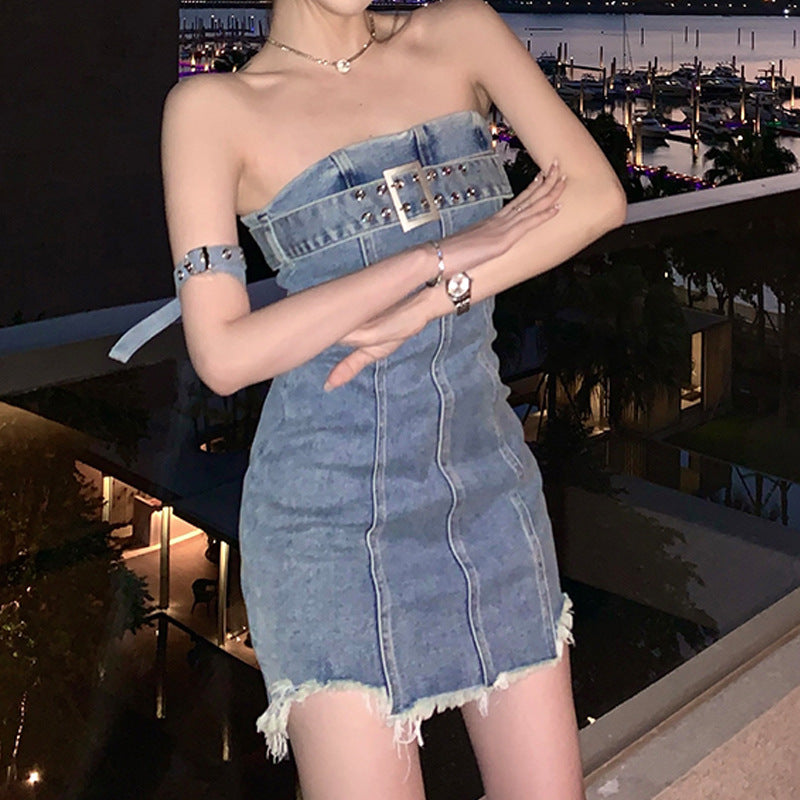 Women Strapless Bodycon Sexy Mini Denim Tube Dresses Slim Fit Trendy Club Dresses For Women Going Out Jean Dress AP00215