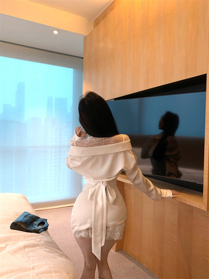 New Fashion White Satin Off-Shoulder Mini Skirt Novelty Natural Ruched Lace-Paneled Date Night Short Dress AP1682