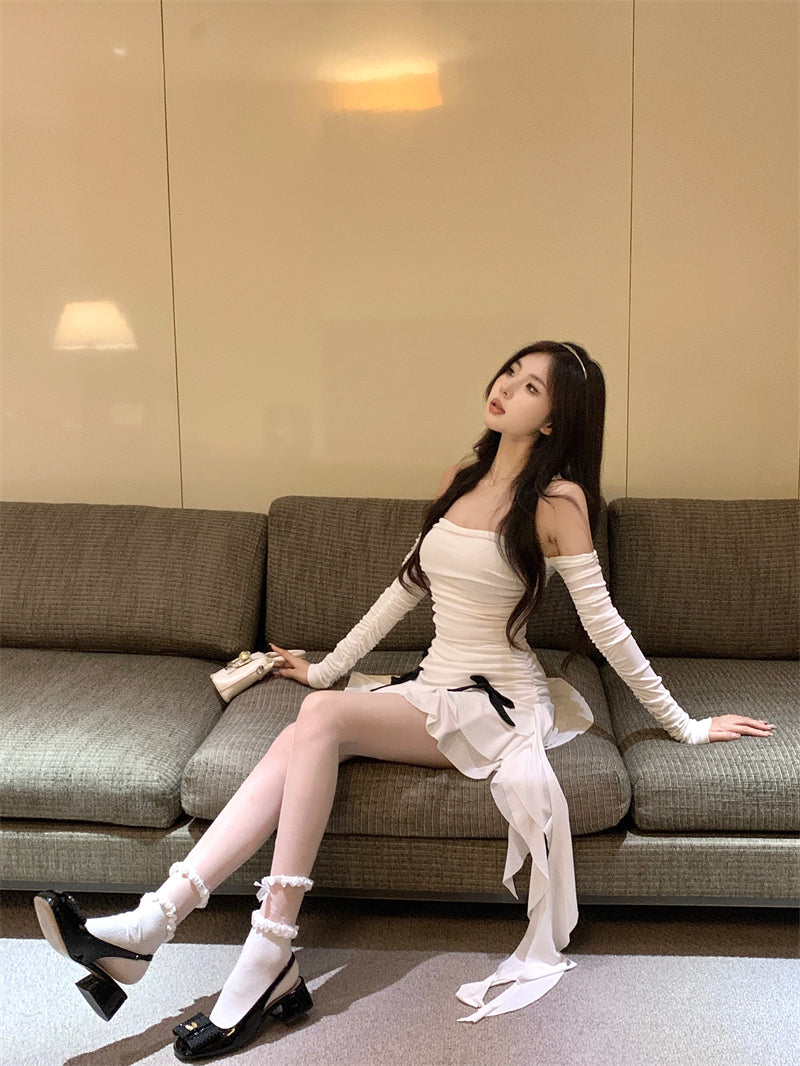 Hot Sales White Off-Shoulder Ruched Sleeve Tiered Mini Skirt Charming Black Bow Accents Short Dress AP1713