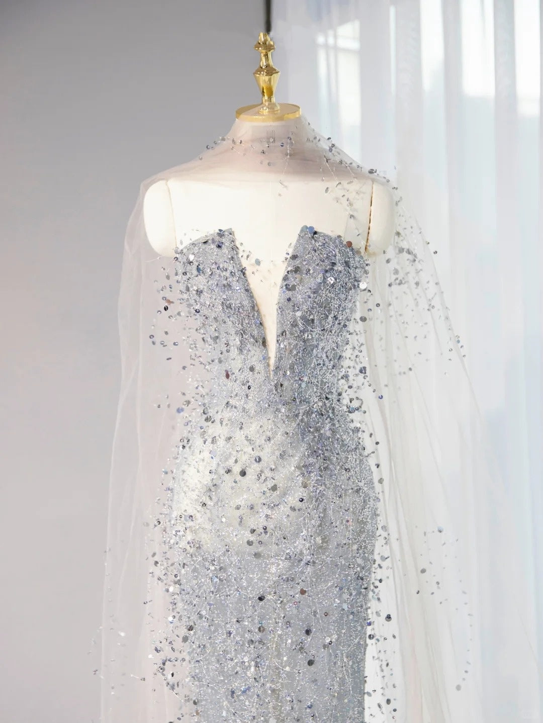 Lustrous Sequins Bodycon Mermaid Dress Tulle Stole V-Neck Strapless Prom Dress AP1035