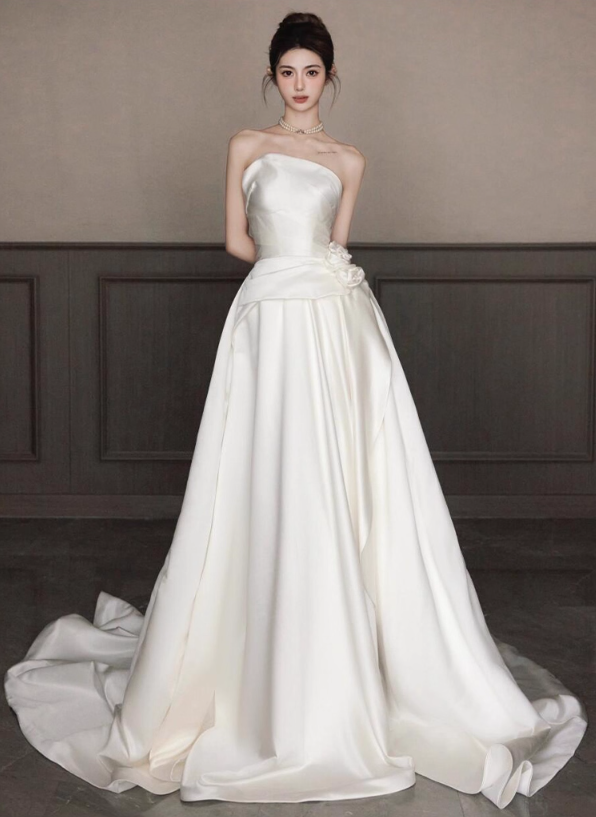 Charming Floral Ornament Smooth Satin Fabric Engagement Dress Strapless Soft Bottom Wedding Dress AP0868