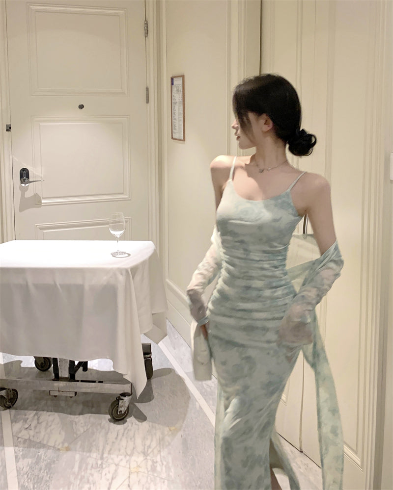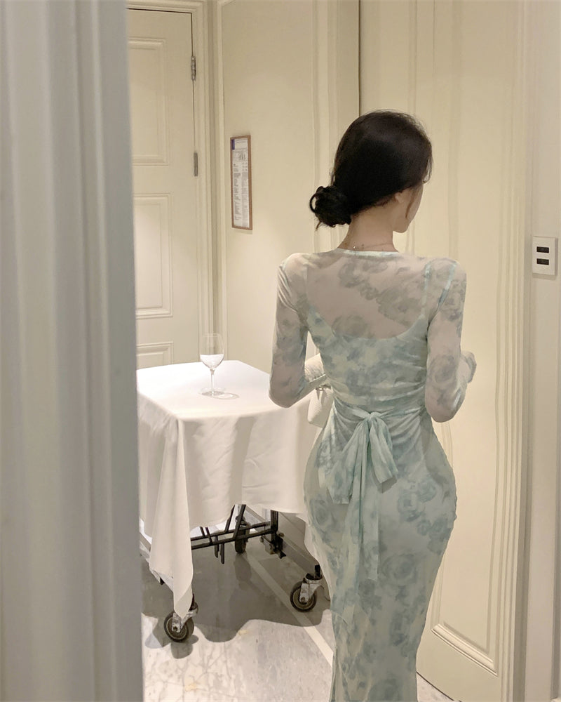 Novelty Blue-Green Watercolor Print 2-Piece Set Maxi Skirt Vintage Long Sleeve Sheer Mesh Cardigan Long Dress AP1661