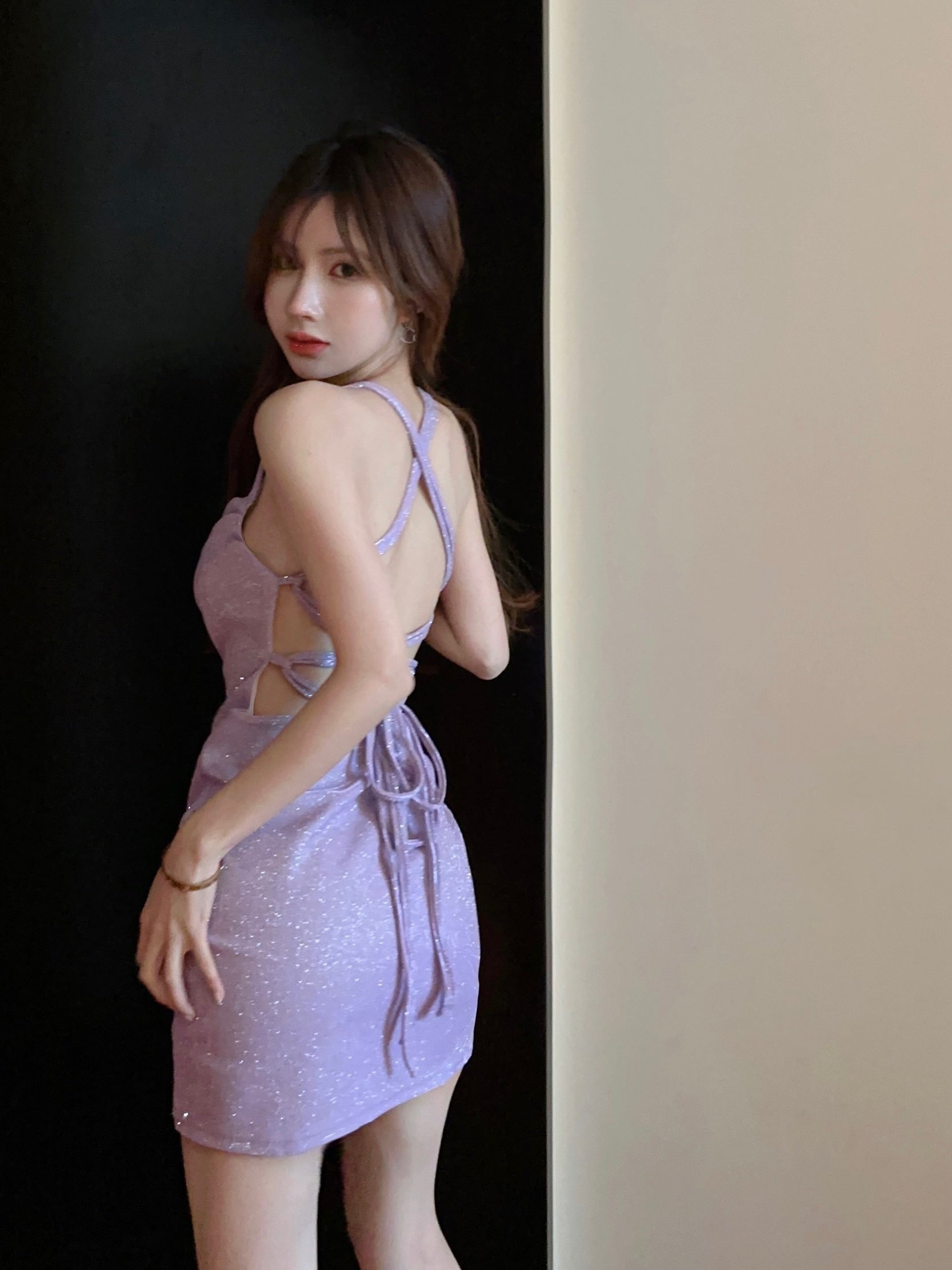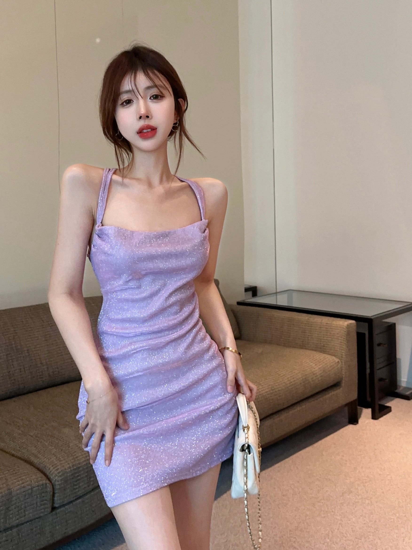 Elegant Sleeveless Sheen Bodycon Party Skirt Strap Overlap Halter Short Dress AP0457