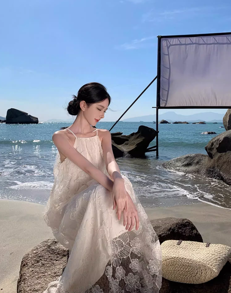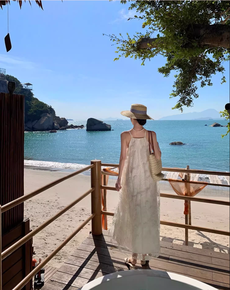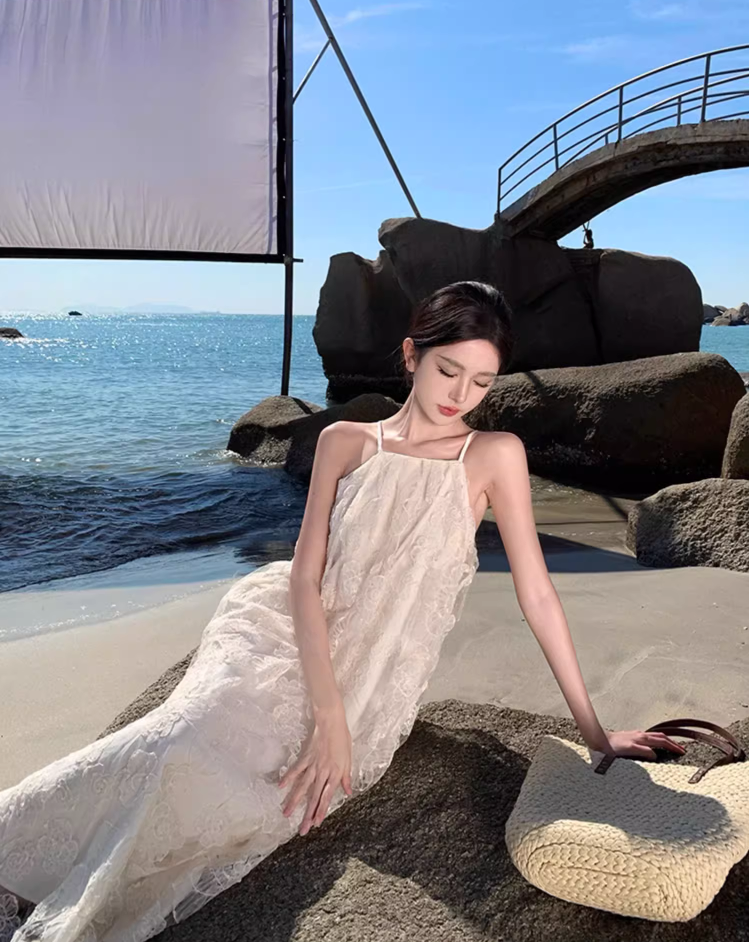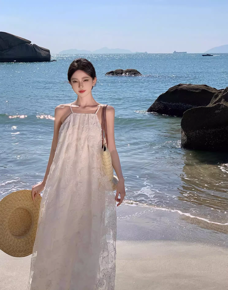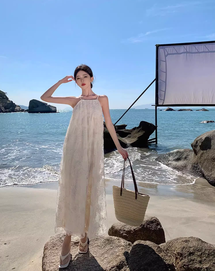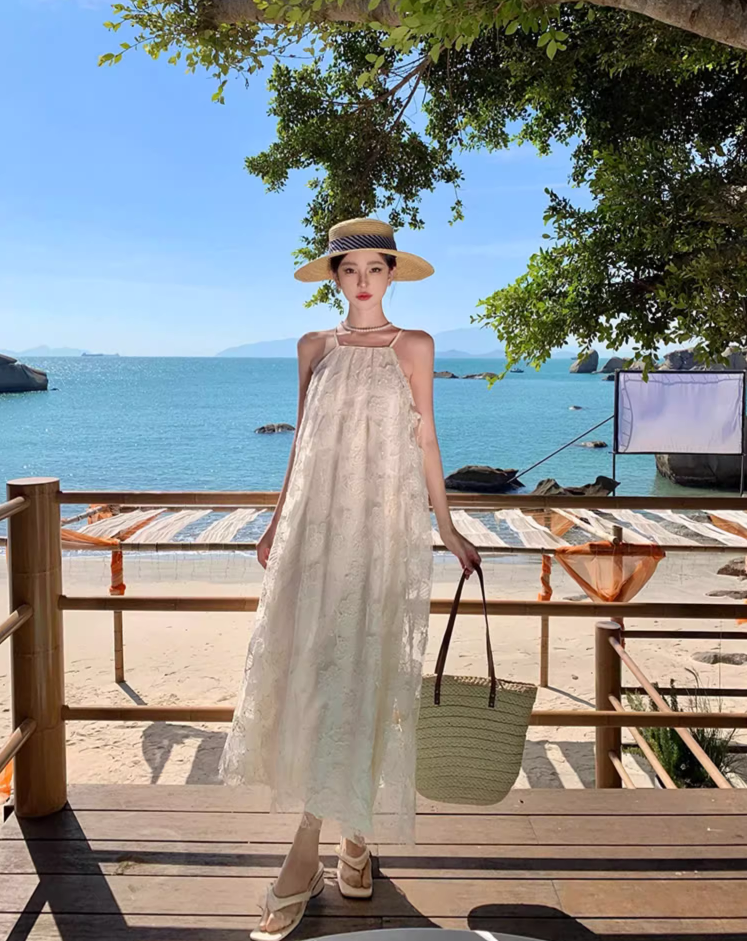 Graceful Sheer Lace Overlay Double Layers Maxi Dress Chic Flowy Loose Style Halter Long Dress AP1176