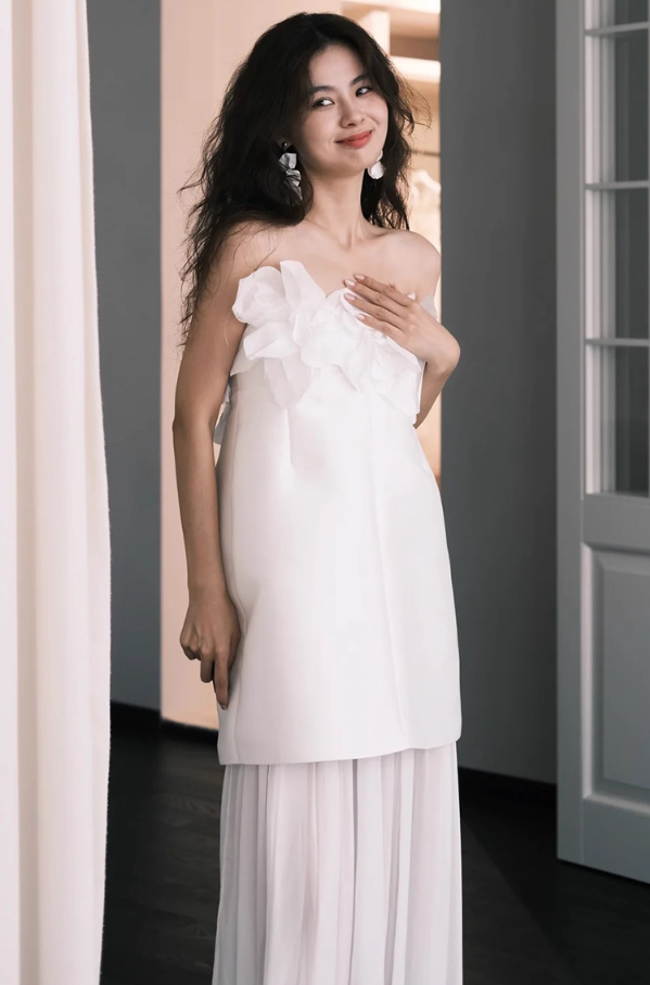Minimalist Applique Tulle Splicing Bridal Dress Strapless Smooth Fabric Wedding Dress AP0835