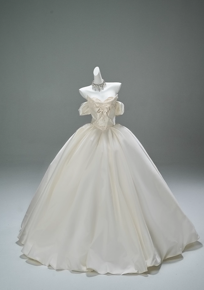 Lovely Off-Shoulder A-Line Bridal Gowns Artistic Beading Pearls Bow Satin Wedding Dress AP3869