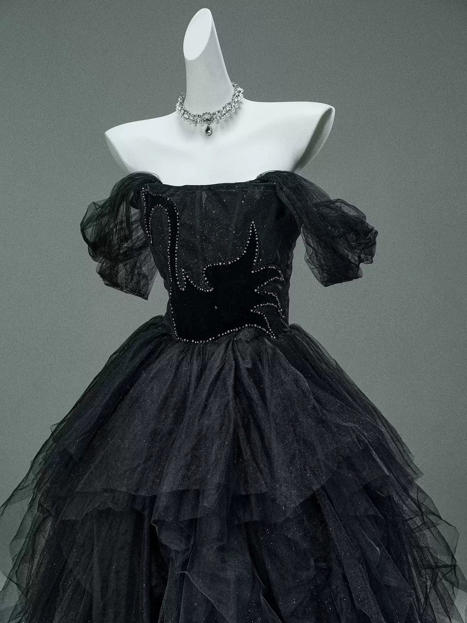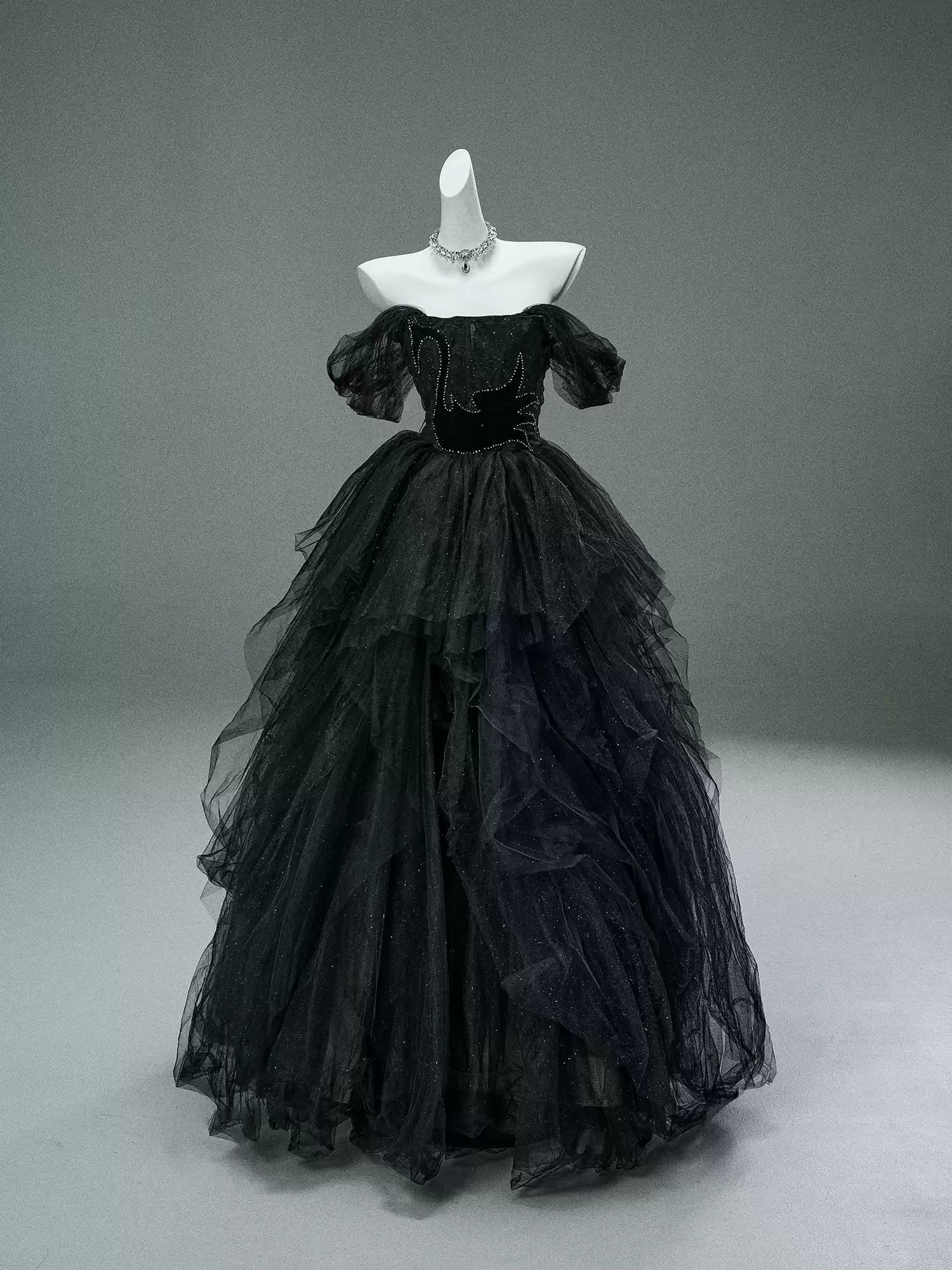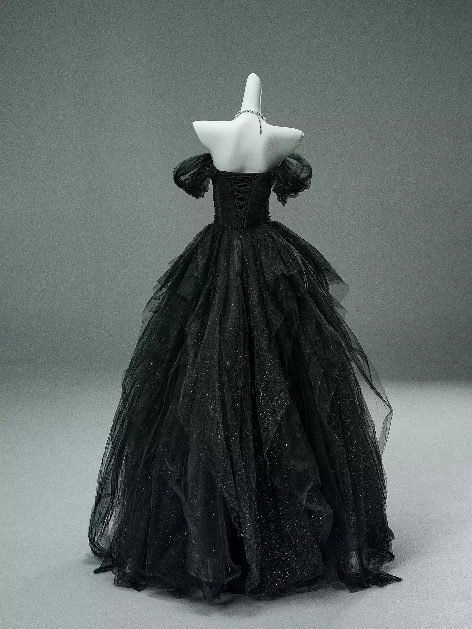 Vogue Off-Shoulder A-Line Sweet 16th Gowns Gothic-Style Sequins Black Tulle Prom Dress AP3921