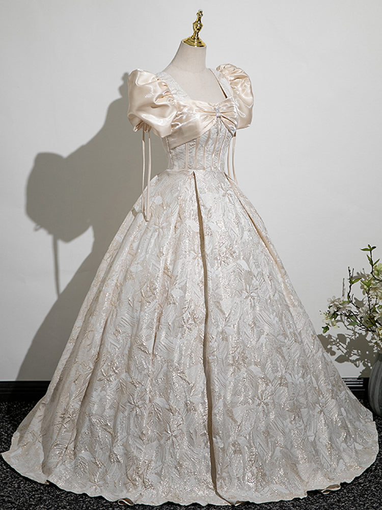 New Arrival Champagne Puff Sleeve Elegant Square Neck A-line Prom Long Dress AP0633