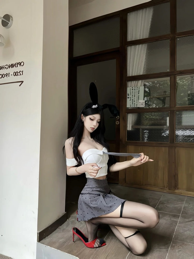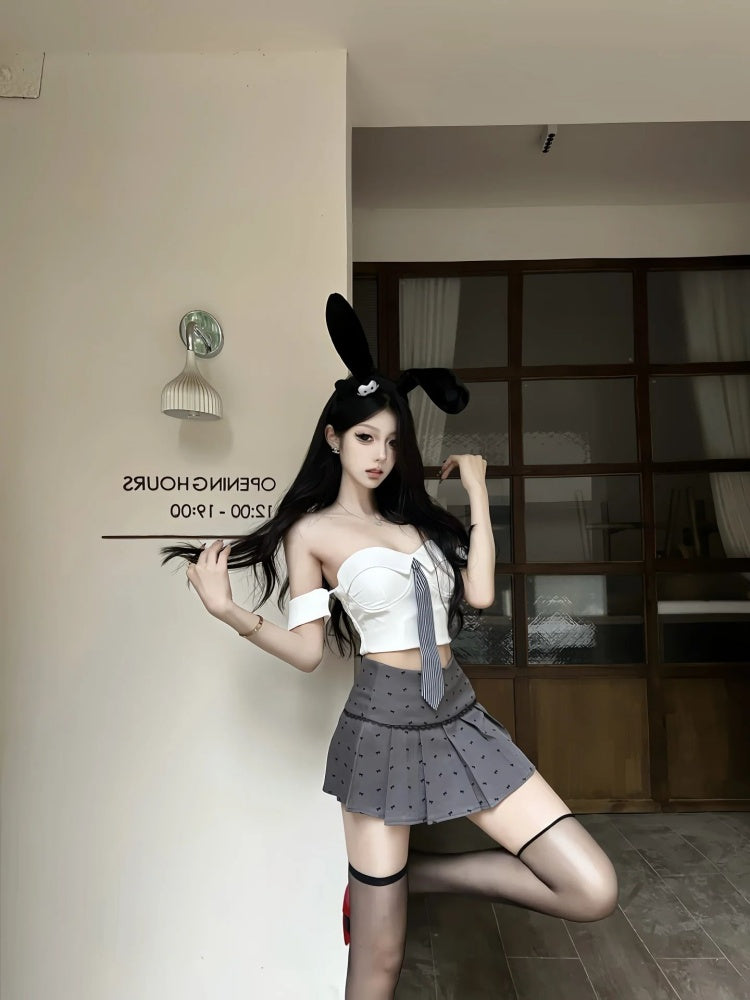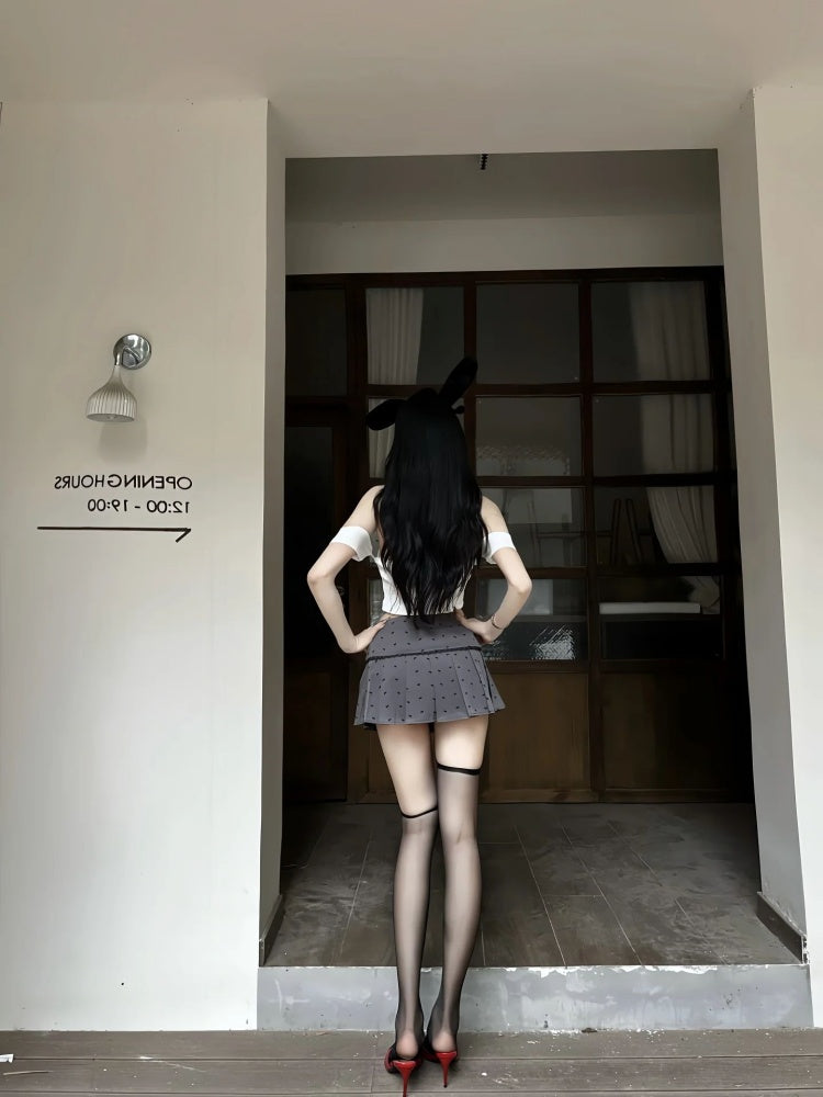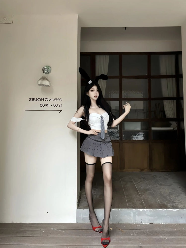 Glam Off-Shoulder Tie Bodice 2-Piece Set Mini Skirt Trendy A-Line Polka Dots Pleated Short Dress AP4037