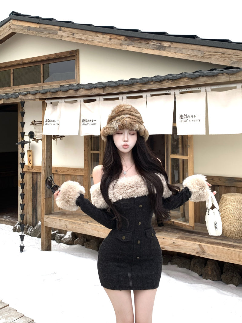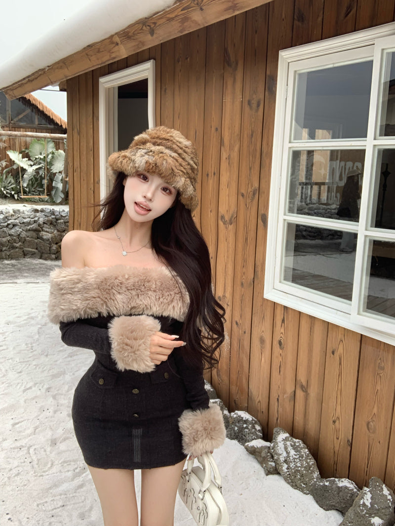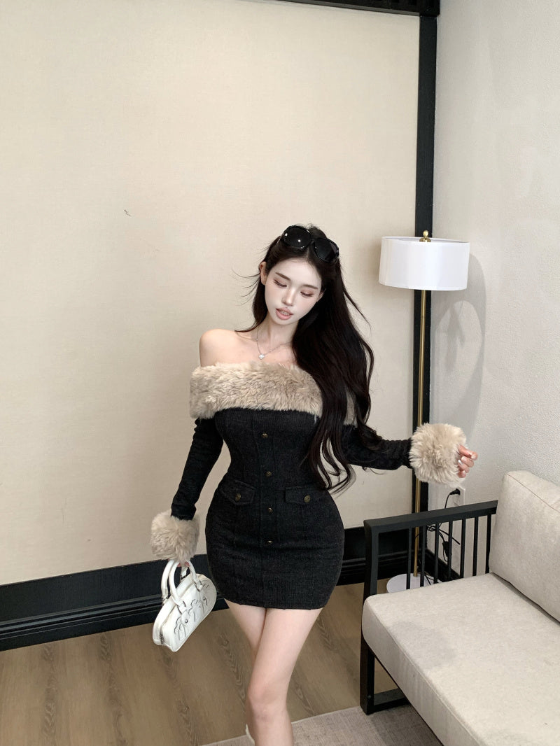 Charming Fur Trim Off-Shoulder Mini Skirt Novelty Bodycon Long Sleeve Short Dress AP3634