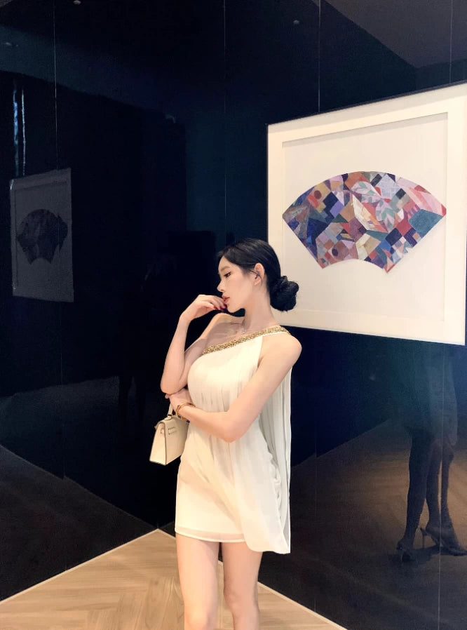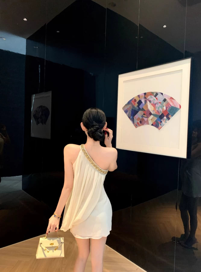 Glamorous One-Shoulder White Tulle Splicing Mini Dress Bodycon Sequins Accent Short Dress AP4038