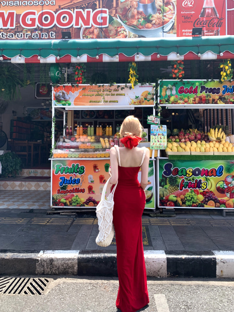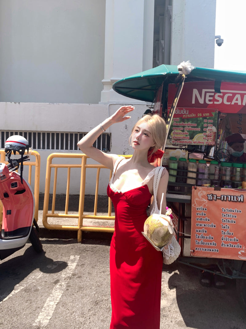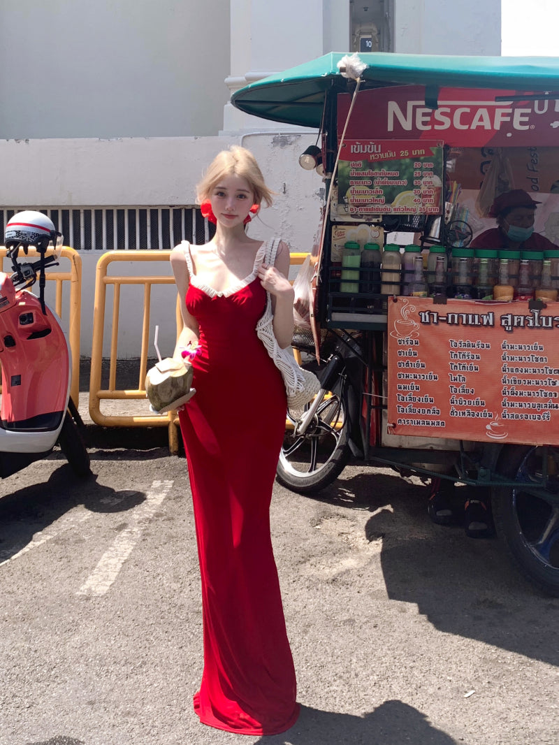 Unique Vocation Outfit Spaghetti Straps Red Mermaid Maxi Dress Sexy White Lace Trim Ruched Bodycon Long Dress AP1913