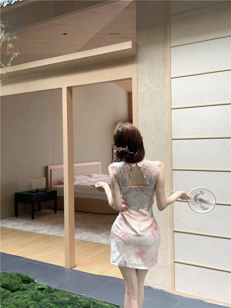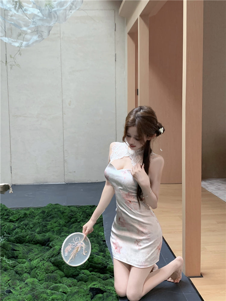 Classical Pink Blush Watercolor Floral Print Mini Skirt Oriental Lace Trimmed Round Collar Date Night Halter Short Dress AP1679