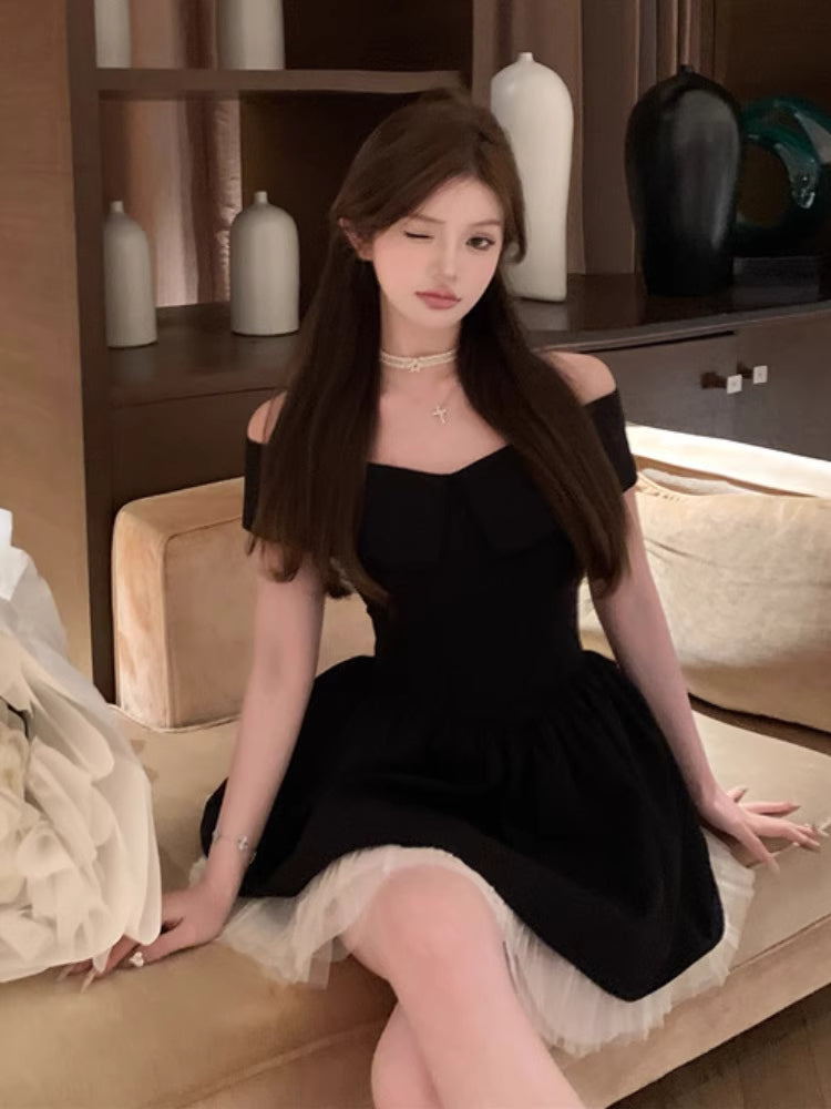 Stylish Black A-Line Off-Shoulder Mini Skirt Dreamy LBD Party Nights Fitted Waist Short Dress AP2028