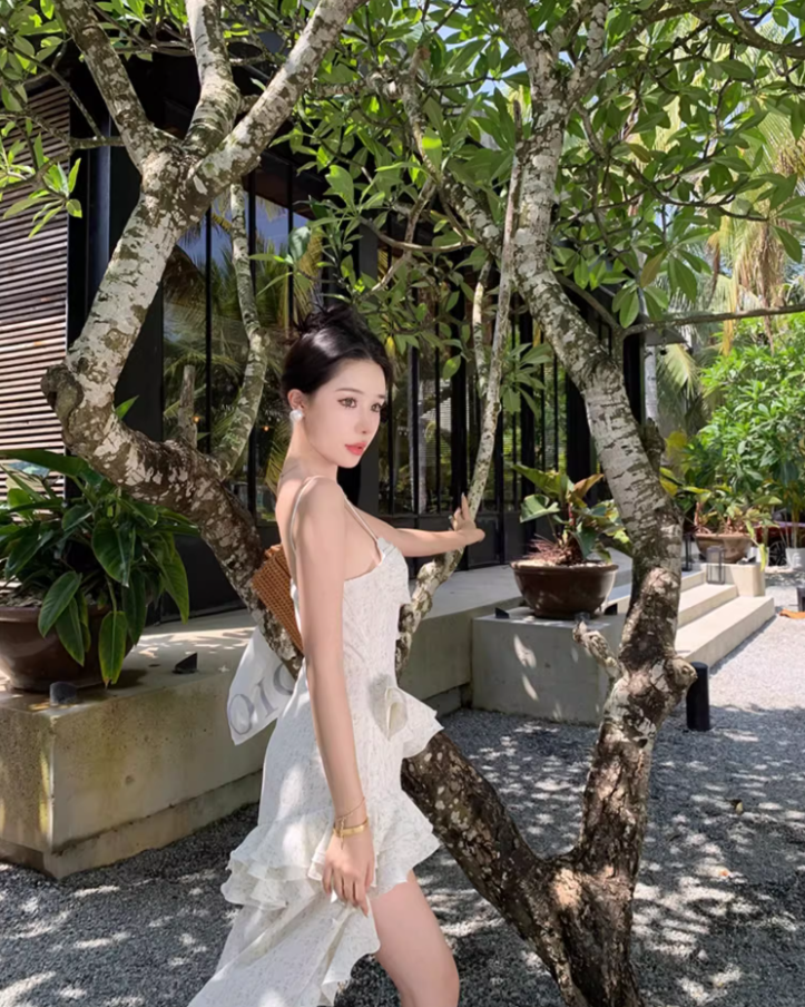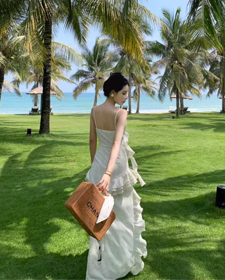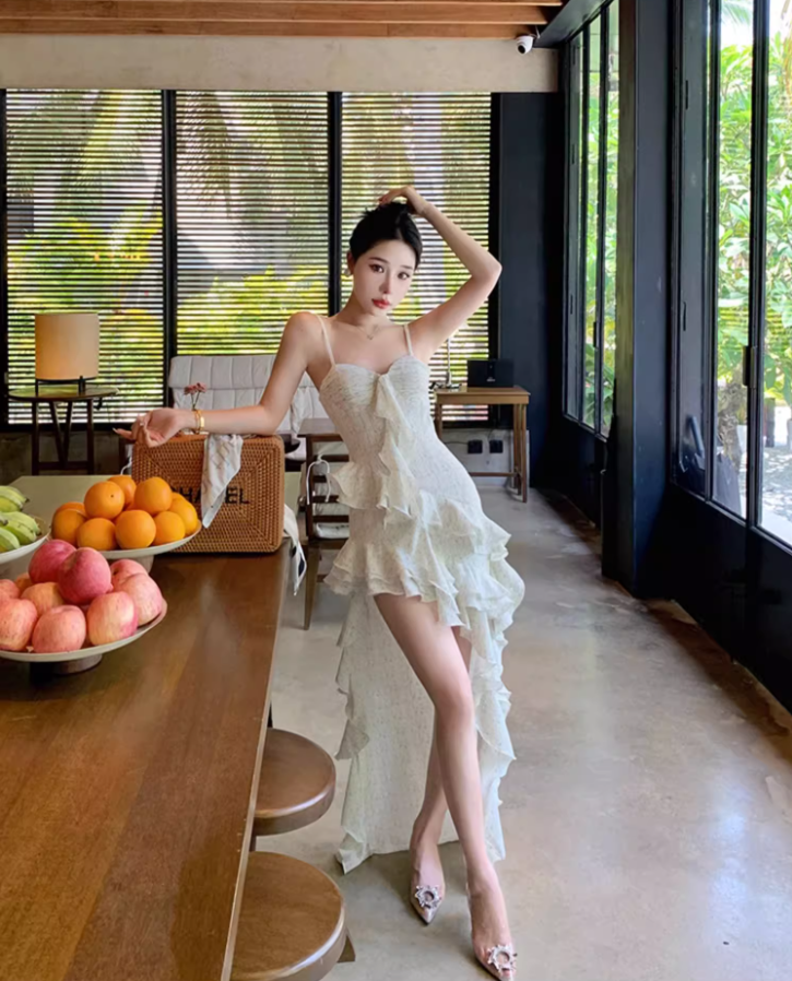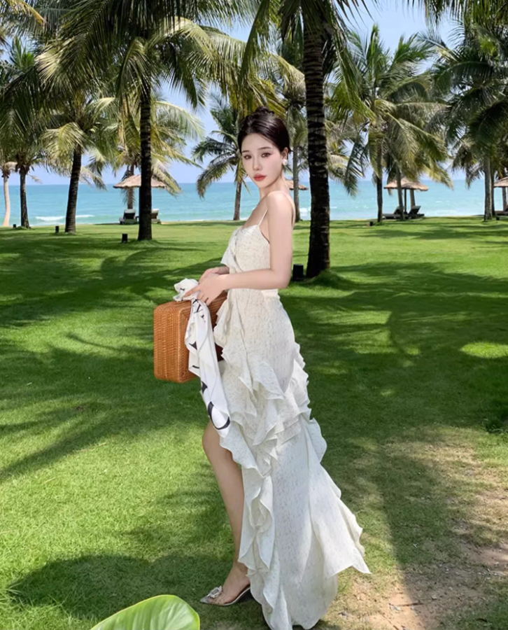 Alluring Tiered Ruffles Swing Hem Maxi Dress French Style Spaghetti Strap Hi-Lo Length Long Dress AP1477