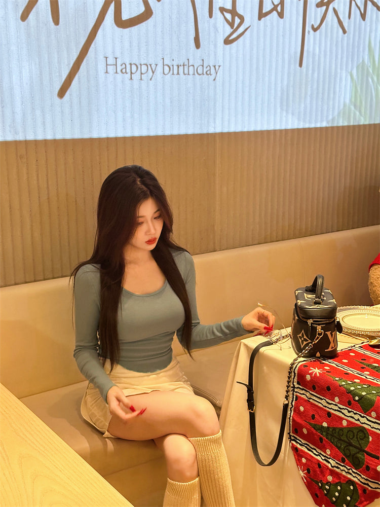 Stylish Blue Top White High-Waisted Mini Skirt Casual Daily Two-Piece Set Long Sleeve Short Dress AP2062