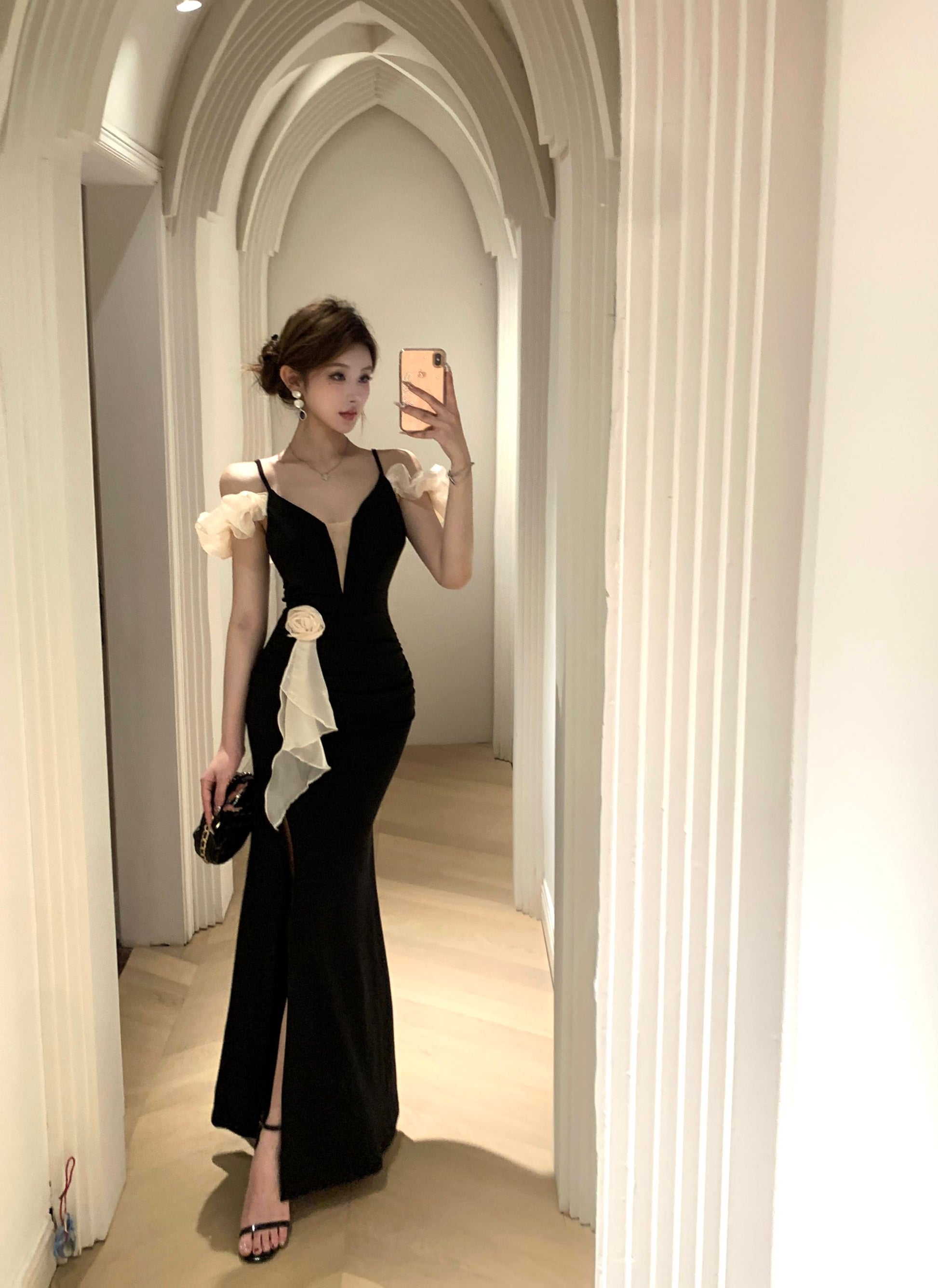 Romantic Asymmetric Sheen Ruffles Off-Shoulder Maxi Dress Glamorous High Slit Black Mermaid White Flower Detail Long Dress AP1921