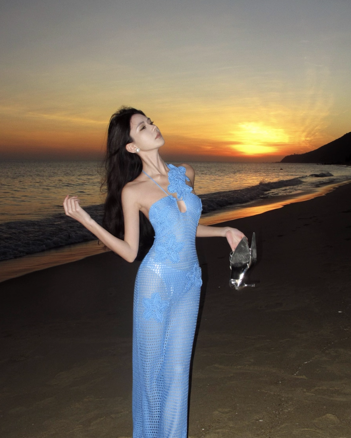 Fashionable Y2K Island Beach Blue Maxi Dress Chic Coastal Shoots Open-Knit Mermaid Halter Long Dress AP1357