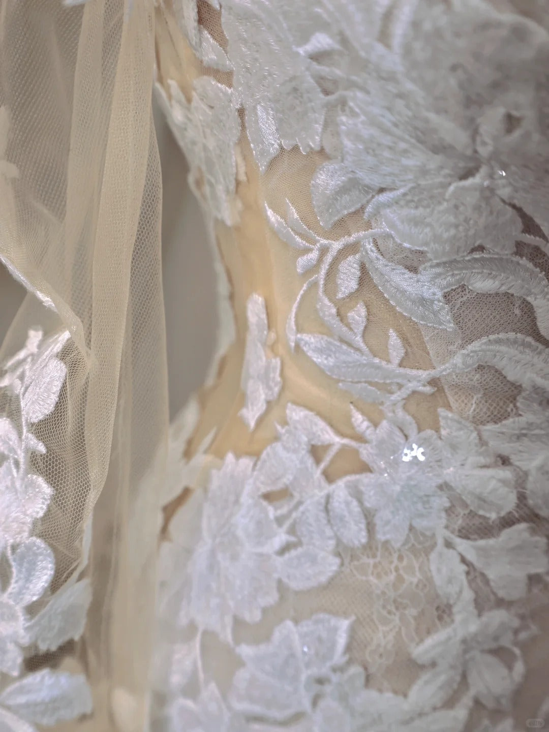Chic Applique Off-Shoulder Mermaid Lace-Up Back Bridal Dress Elegant Long Sleeve Sheer Tulle Layered Wedding Dress AP2183