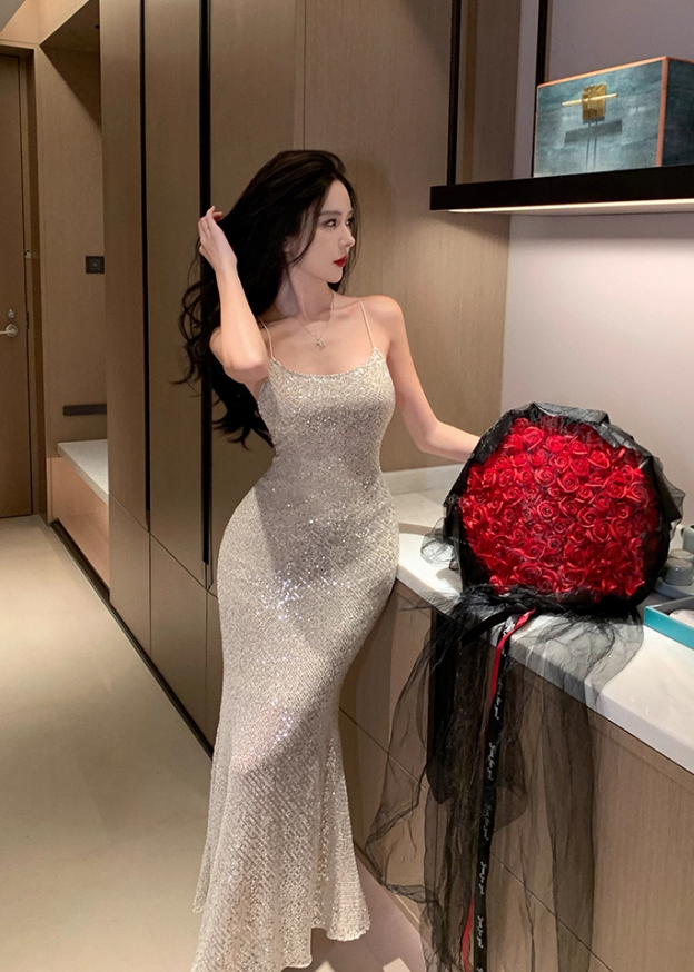 Exquisite Silver Glittering Sequins Mermaid Maxi Dress Charming Feast Bodycon Backless Halter Long Dress AP1451