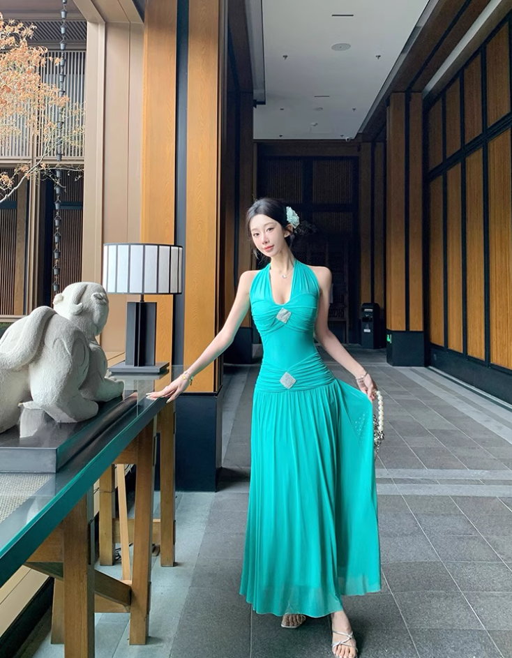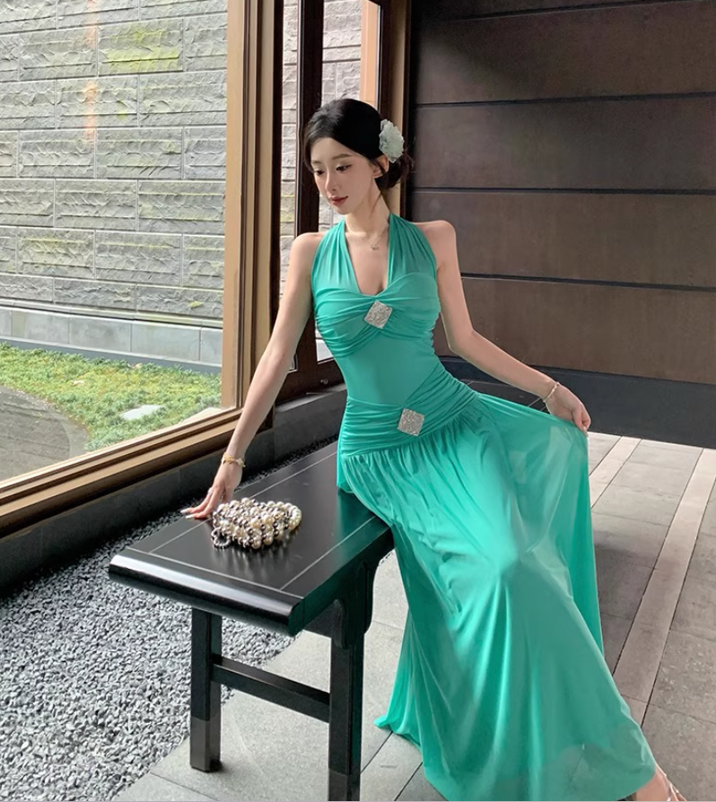 Chic Soft Fabric Cinched-Waist Maxi Dress Open Back Flexible Sheer Tulle Overlay Halter Long Dress AP1261