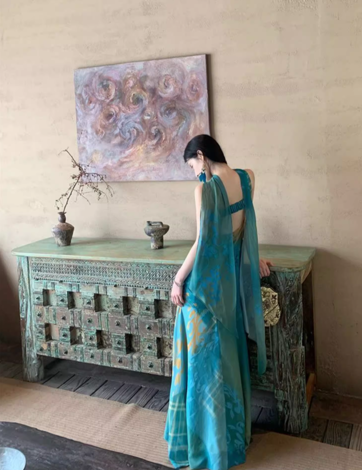 Boho Style Artistic Patterns Maxi Dress Flowy Design Spaghetti Strap Long Dress AP1092