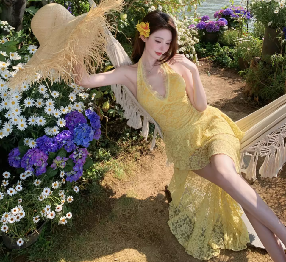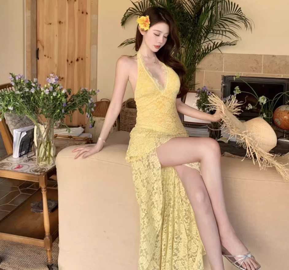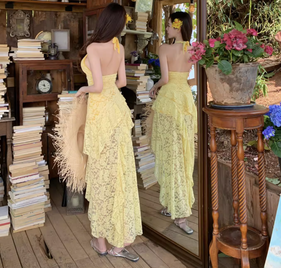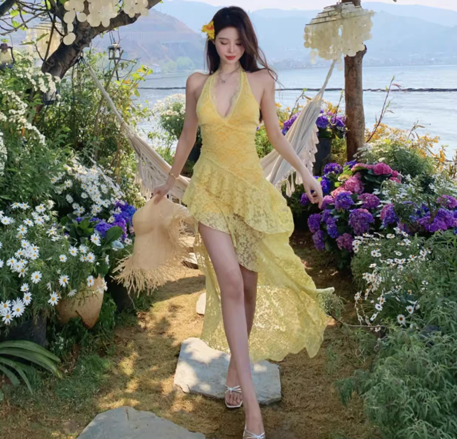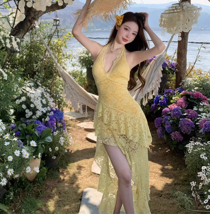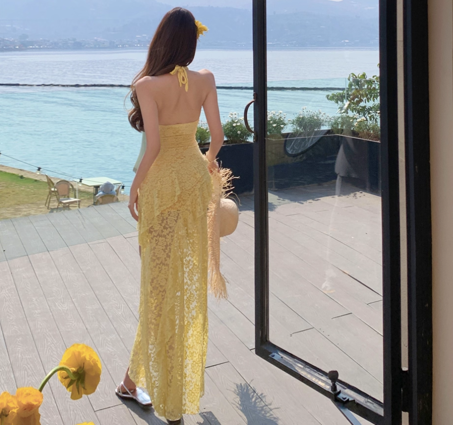 Asymmetrical Hem Lightweight Vacation Midi Dress Backless V Neck Halter Long Dress AP0422