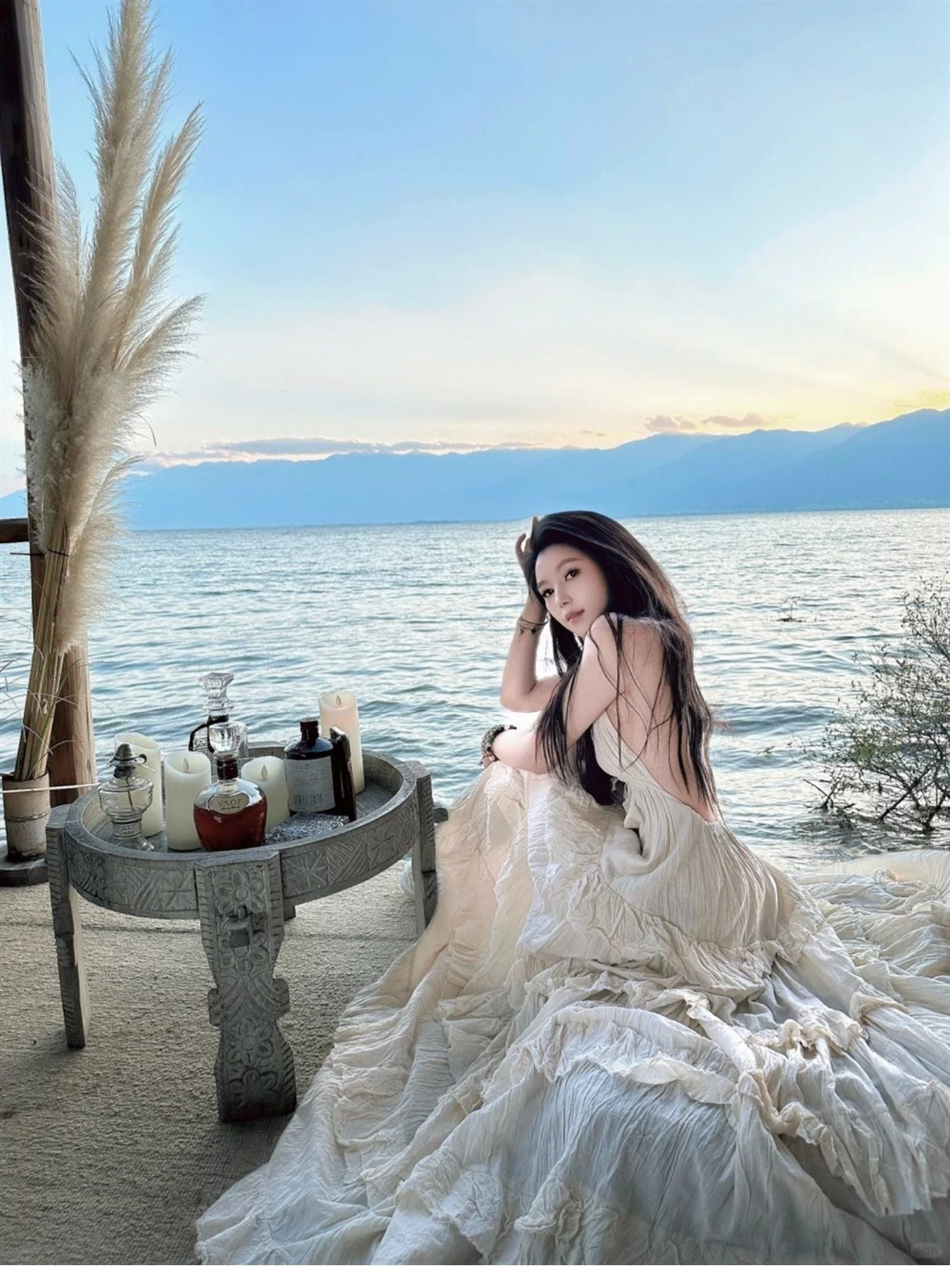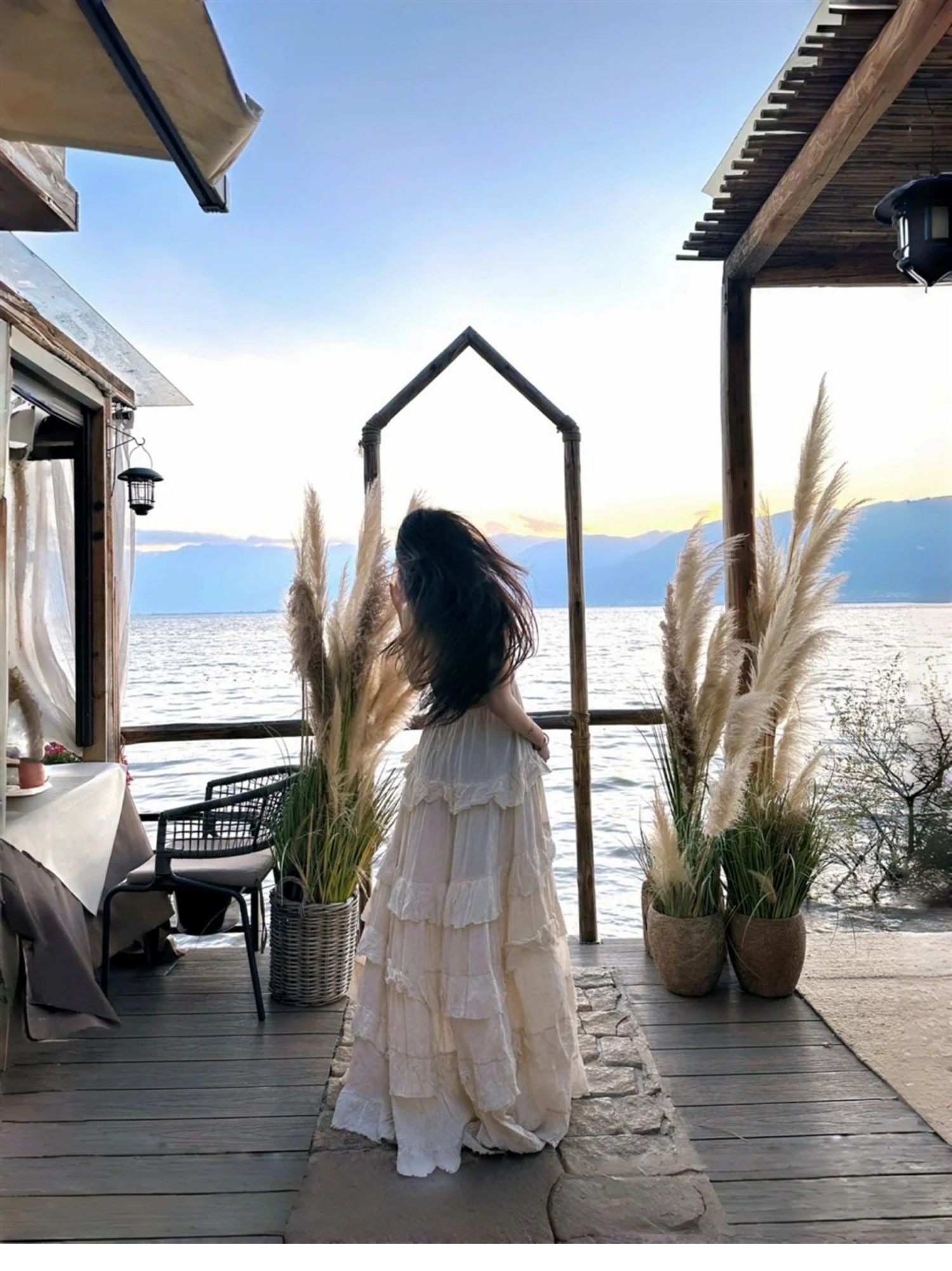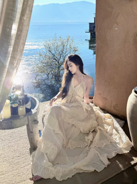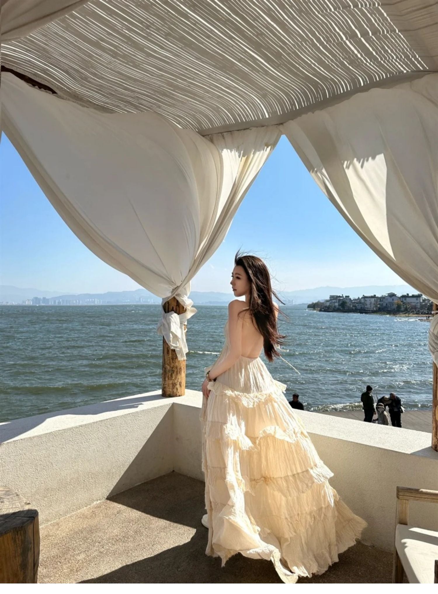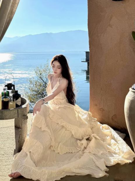 Ethereal Lightweight Ruffles Hem Beach Sundress Backless V Neck Halter Long Dress AP0435