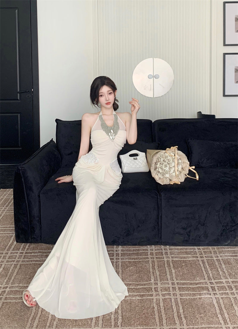 Exquisite Rhinestone Neckline Lace Details Maxi Dress Luxurious Ivory Mermaid Hem Draped Wasit Halter Long Dress AP2060