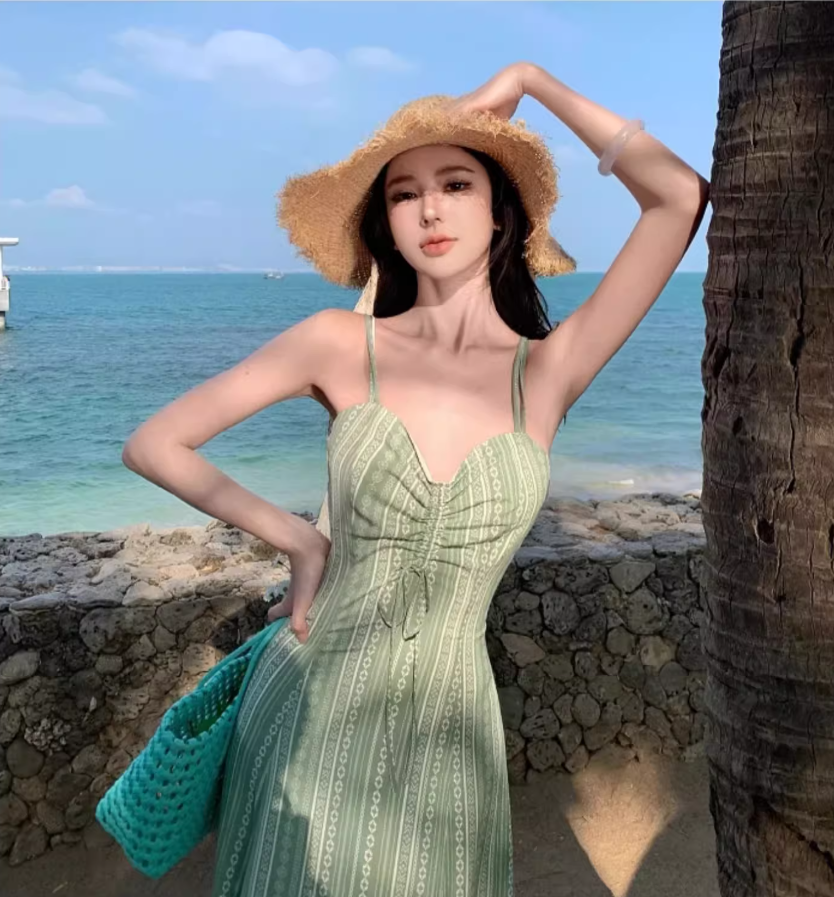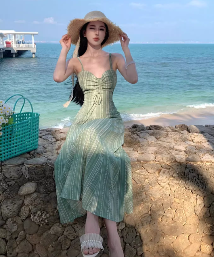 New Fashion Green Ruched Bust Spaghetti Strap Maxi Dress Summer Getaways Tie-Front Striped Long Dress AP1526