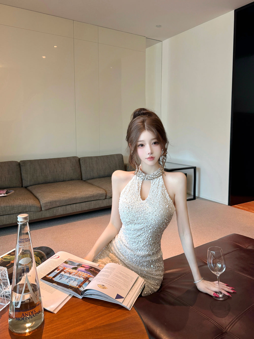 Artistic Sheath Sparkly Sequins Design Evening Maxi Dress Attractive Side Slit Cutout Halter Long Dress AP3762