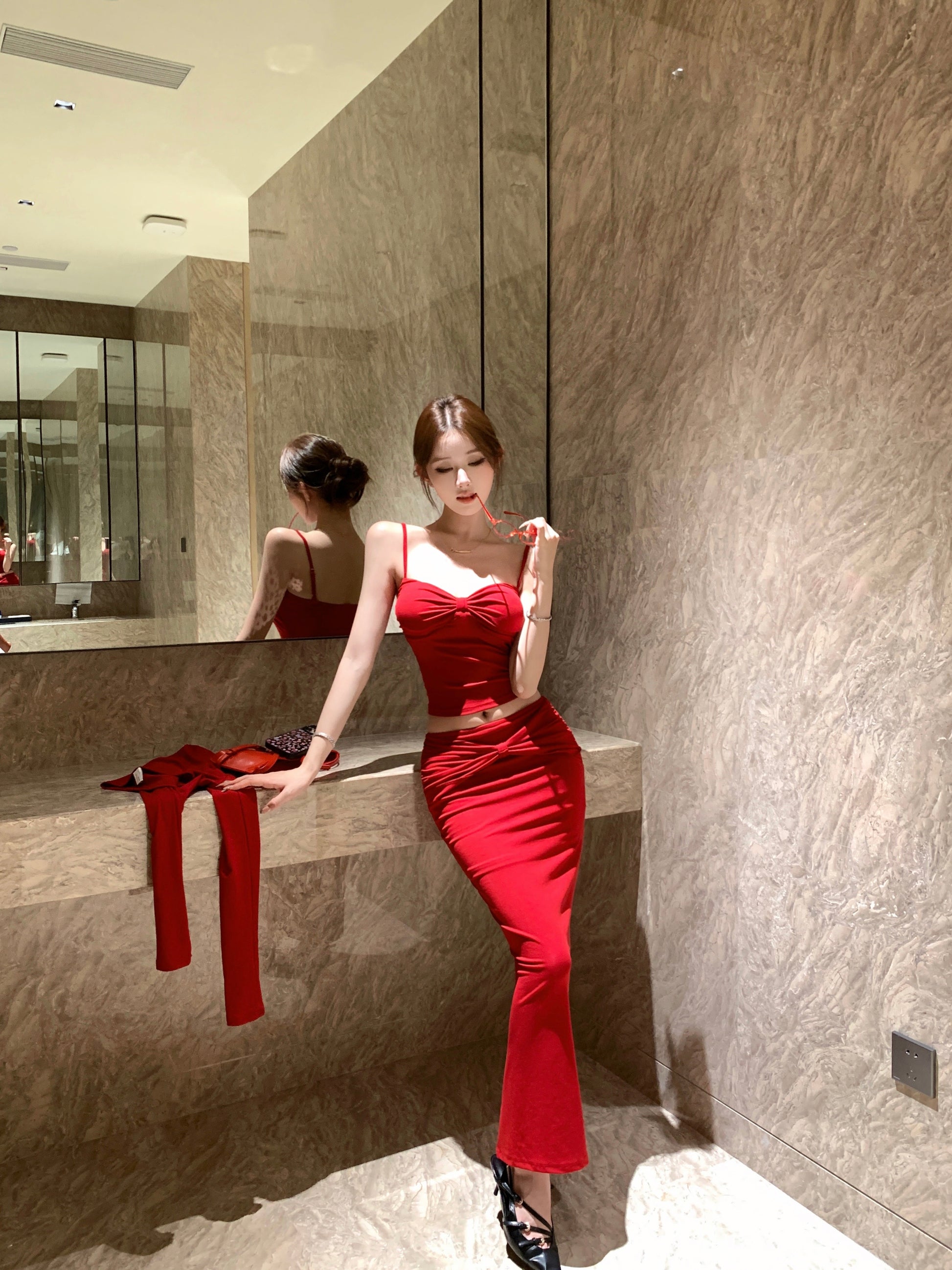 Pretty Red 3-Piece Set Ruched Evening Maxi Dress With Cardigan Alluring Spaghetti Strap Cinched Bodice Sheath Long Dress AP3650