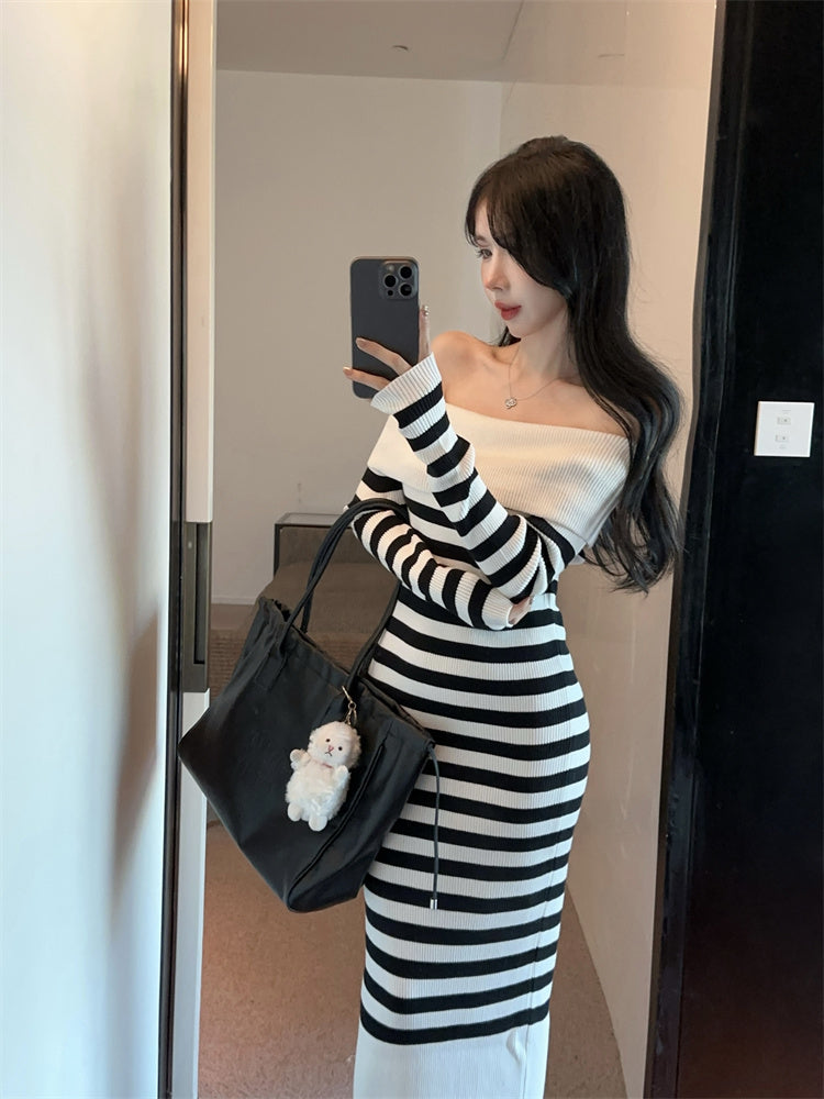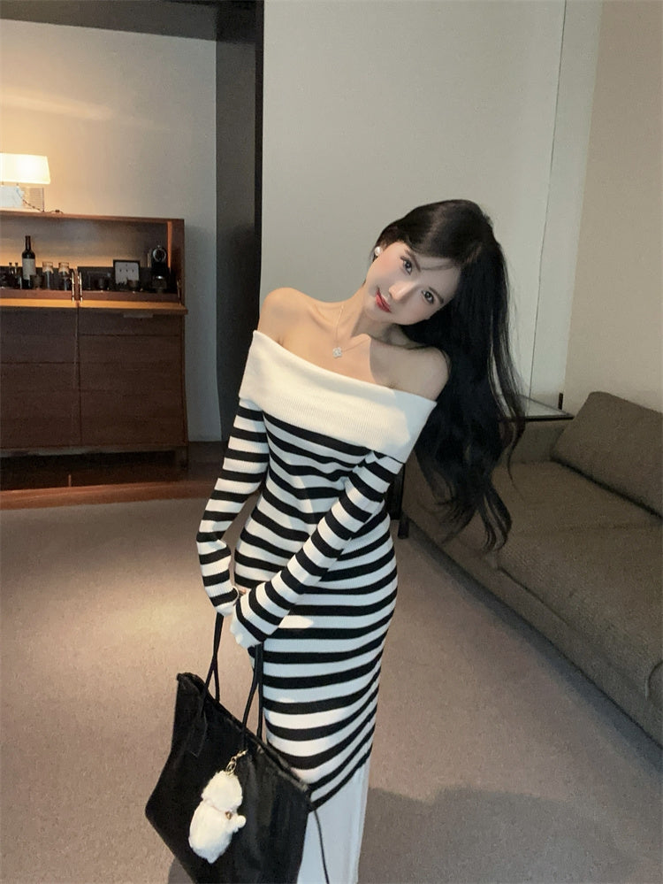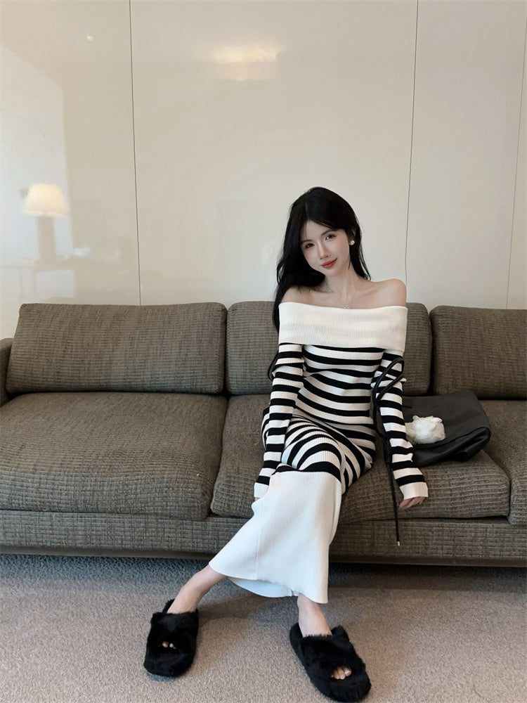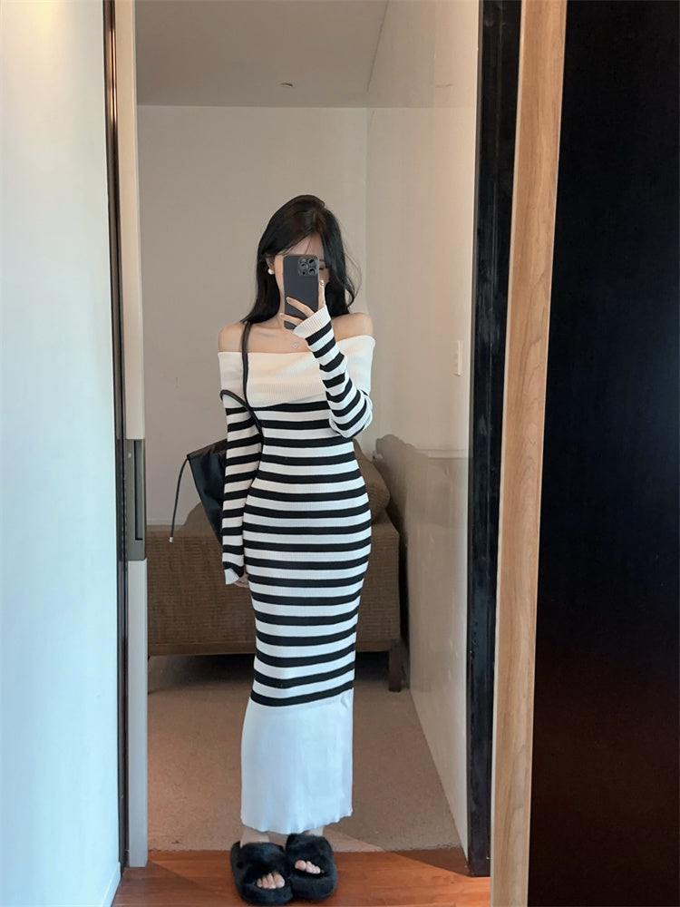 Simple Sheath Long Sleeve Maxi Dress Classical Off-Shoulder Black & White Stripe Long Dress AP3635