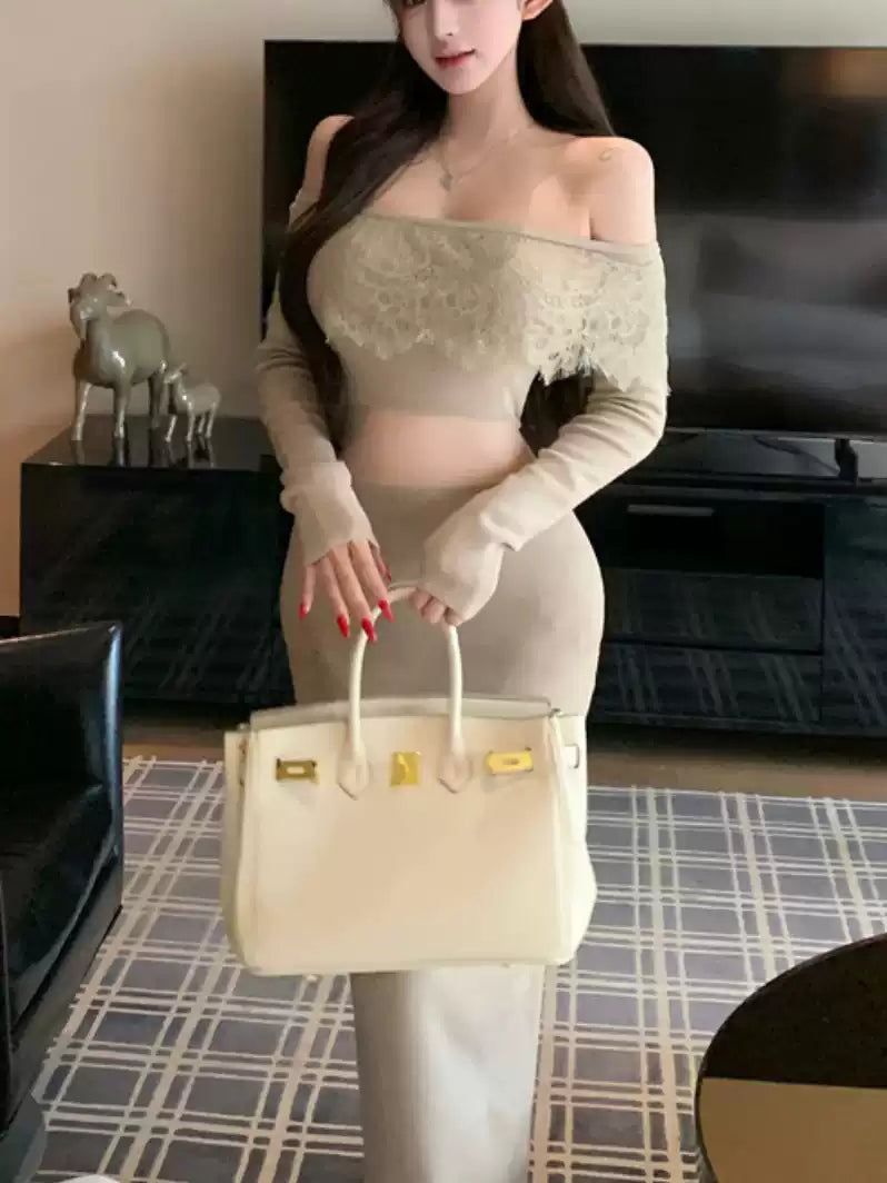 New Tendency Long Sleeve Sheath Sheer Tulle Splicing Maxi Dress Glam Off-Shoulder Lace Trim Slit Long Dress AP3659
