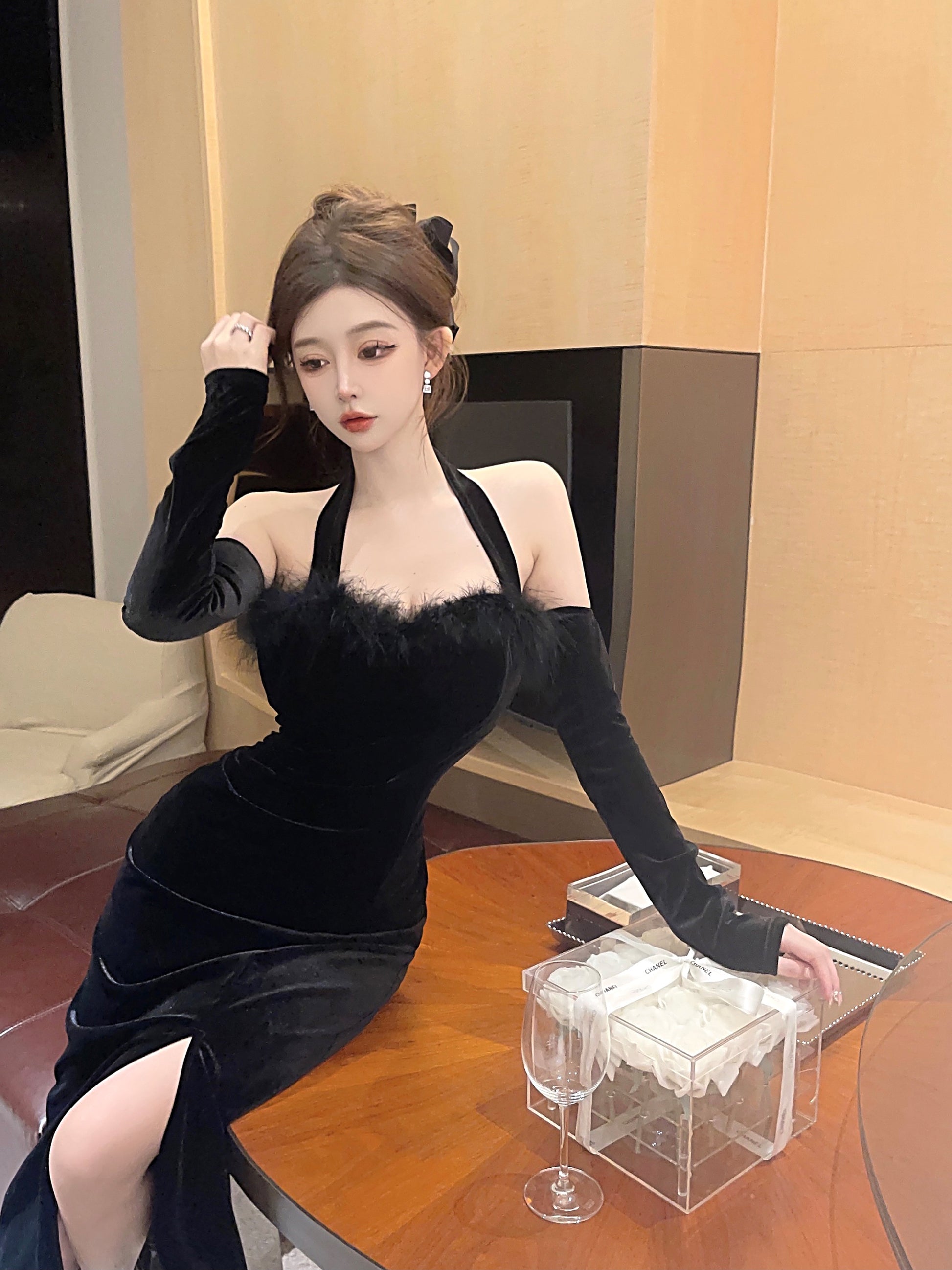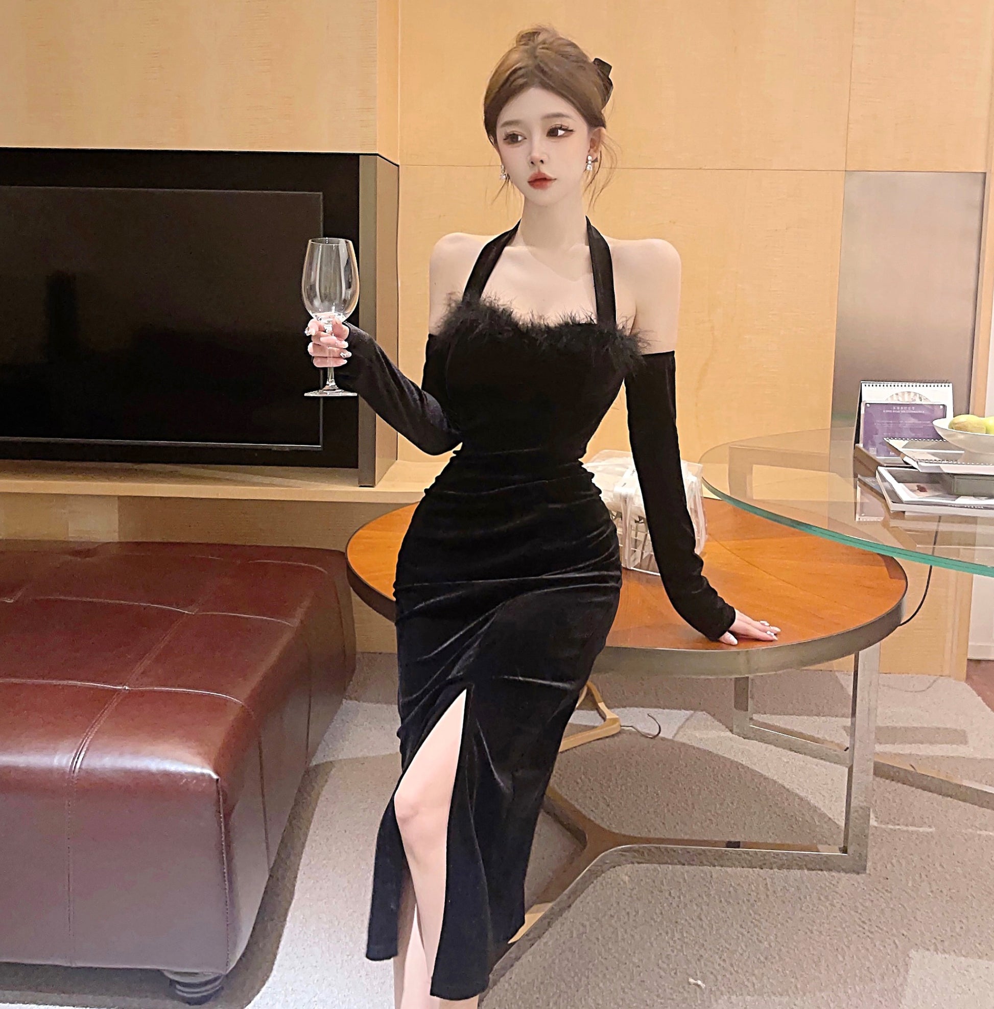Artistic Detachable Sleeve Sheath Maxi Dress Trendy Black Velvet Side Slit Evening Halter Long Dress AP3828