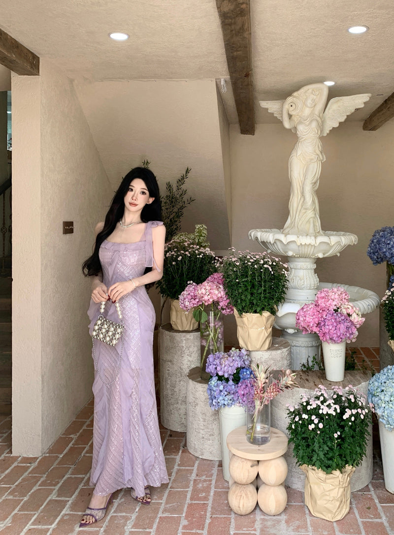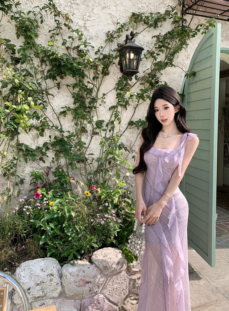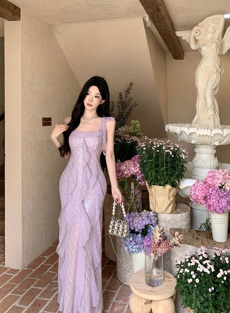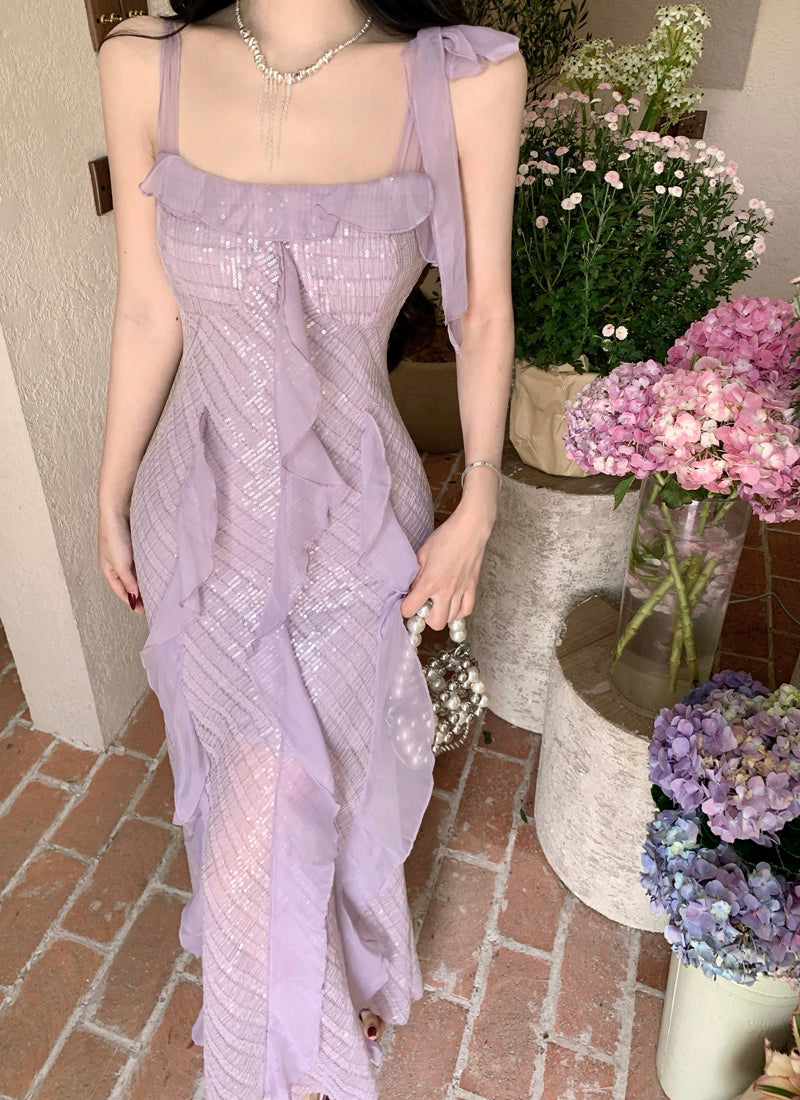 Glittering Sheath Sequins Accent Maxi Dress Vibrant Spaghetti Strap Ruffles Long Dress AP3421