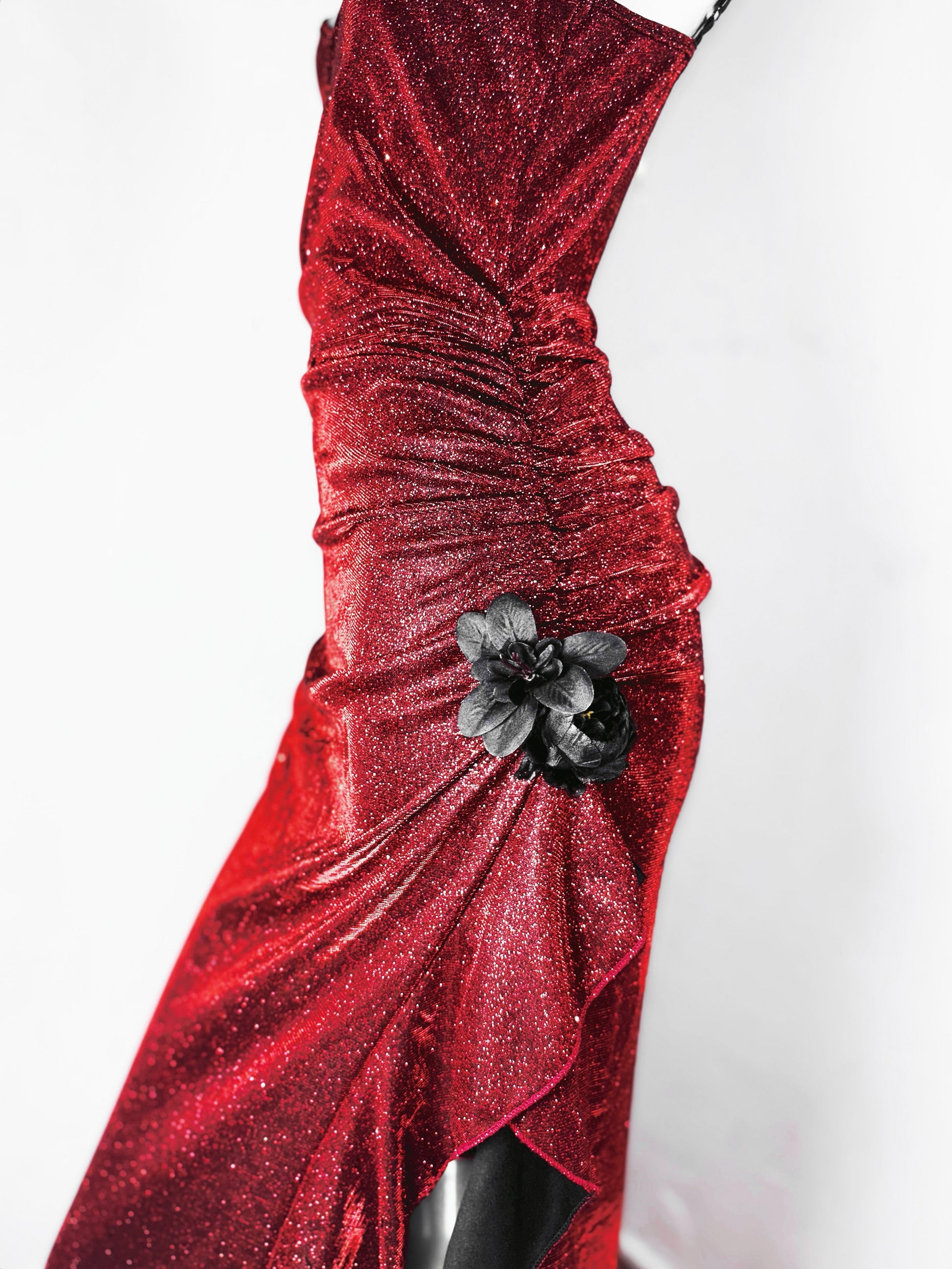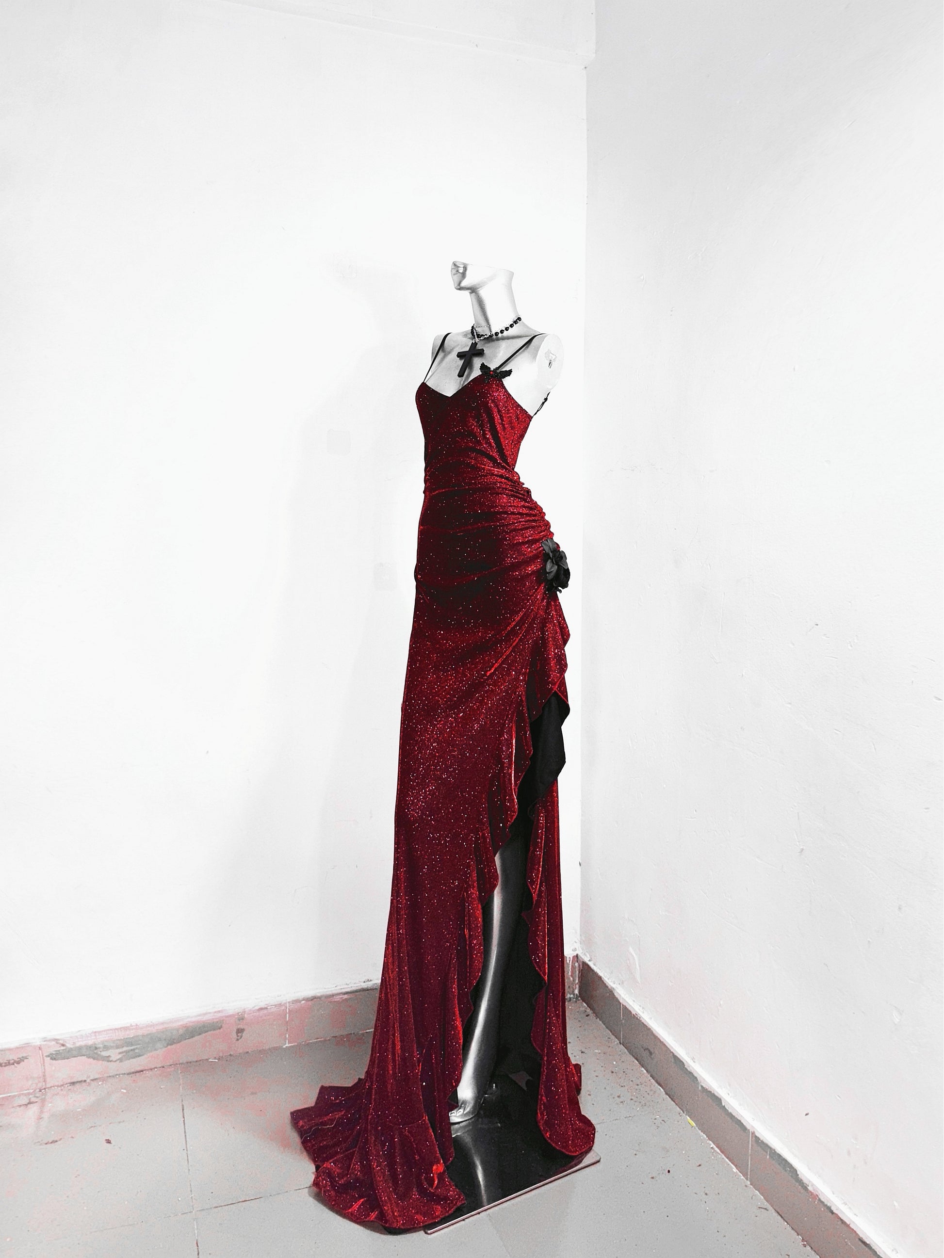 Flattering Sheath Spaghetti Strap Red Evening Dress Applique Sequins Ruffles Slit Prom Dress AP3177