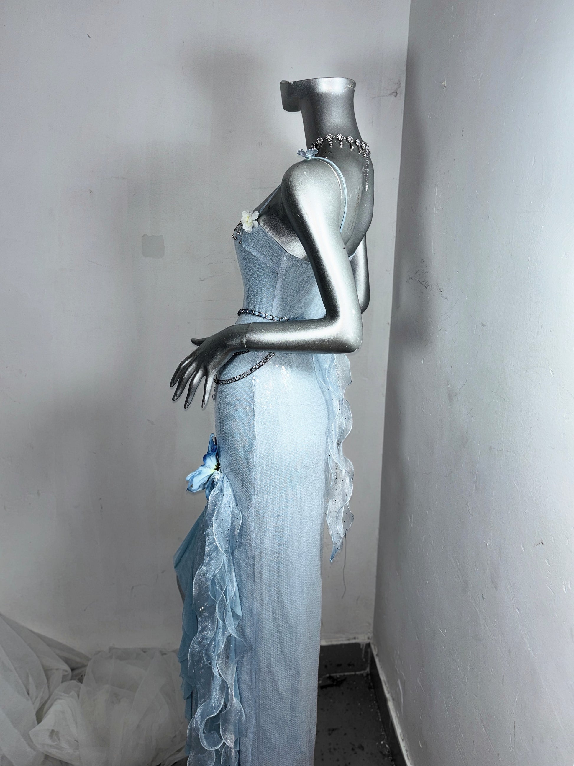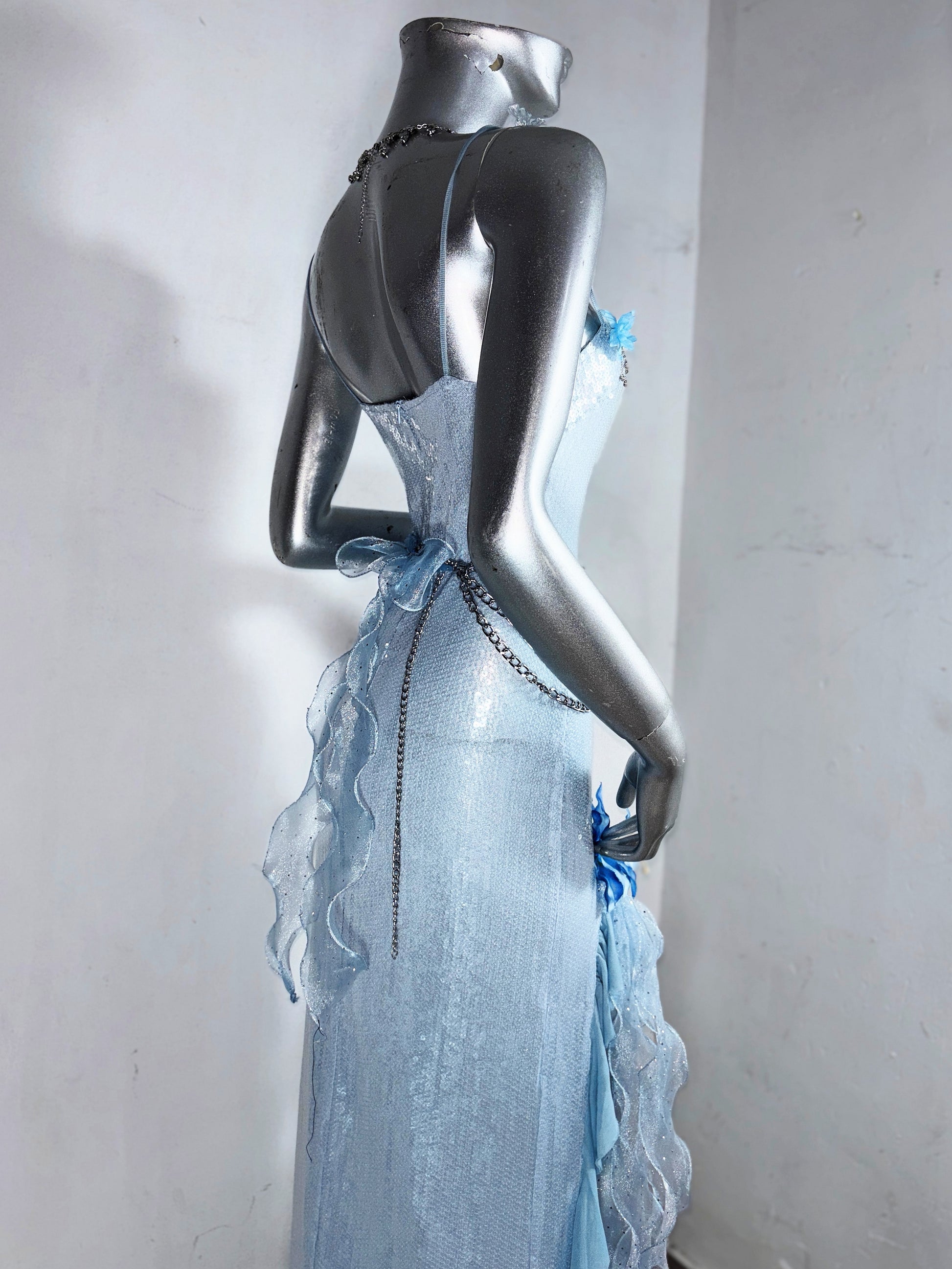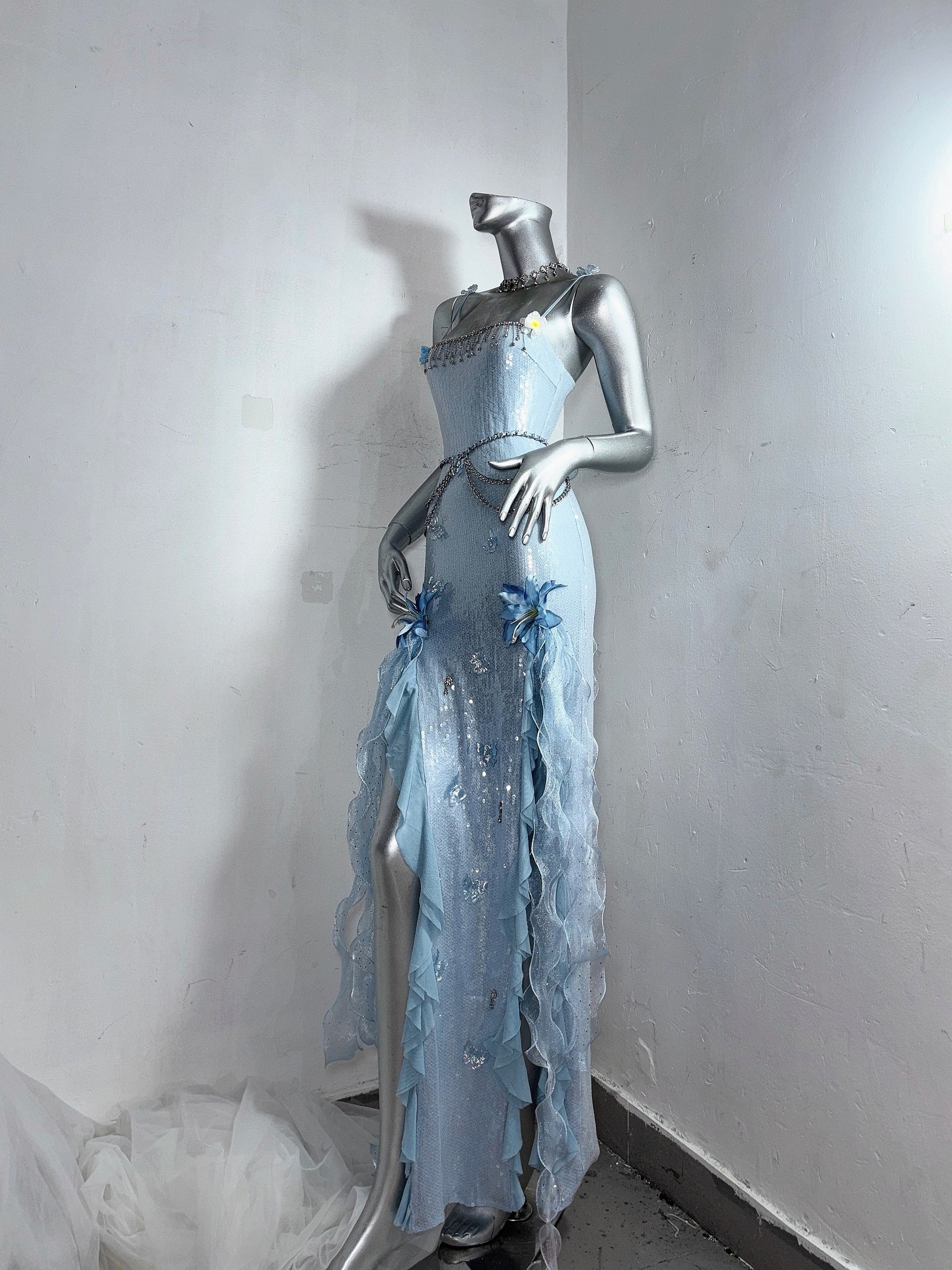 Maximalism Sheath Spaghetti Strap Evening Dress With Slit Sequins Beading Handmade Flowers Ruffles Prom Dress AP3186