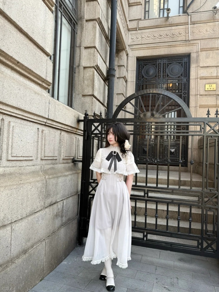 Lovely A-Line Short Sleeve Bow Maxi Skirt Elegant High Collar Ruffles Hem Long Dress AP4072