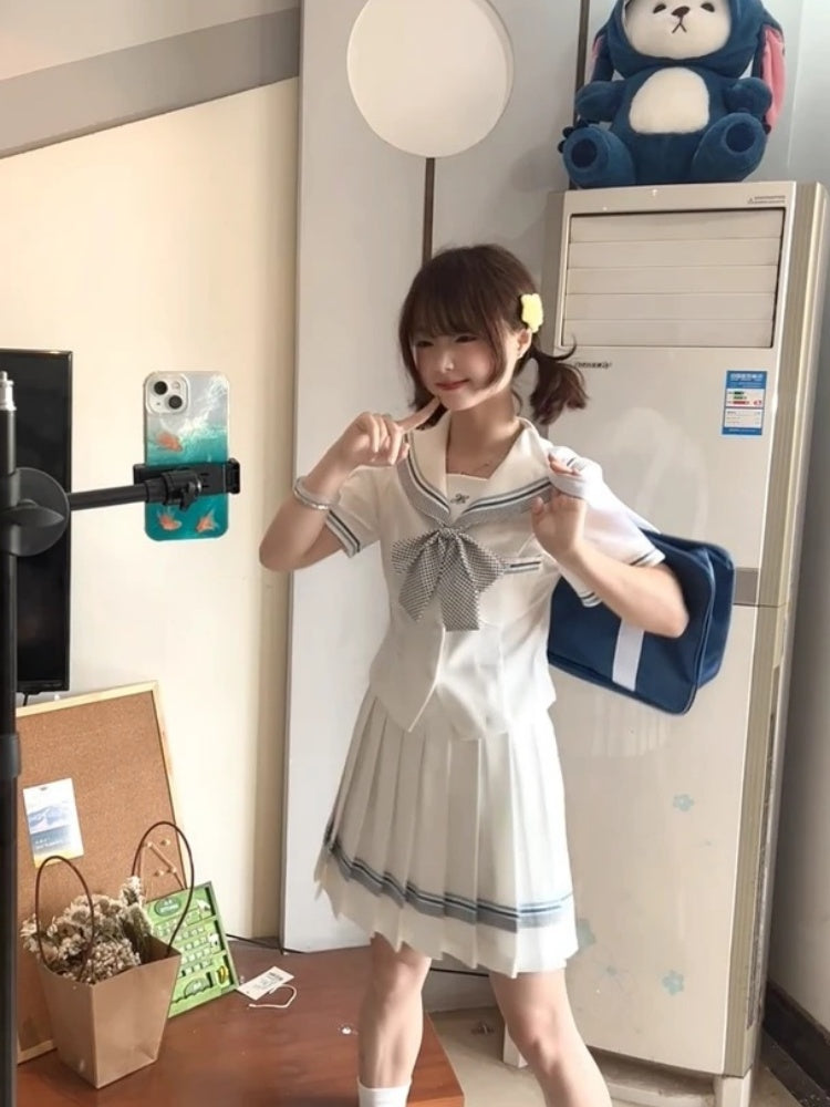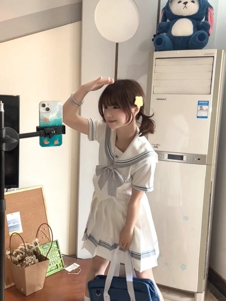 Fitted Sailor Collar A-Line Mini Skirt Charming Short Sleeve Bow Pleated Short Dress AP4051