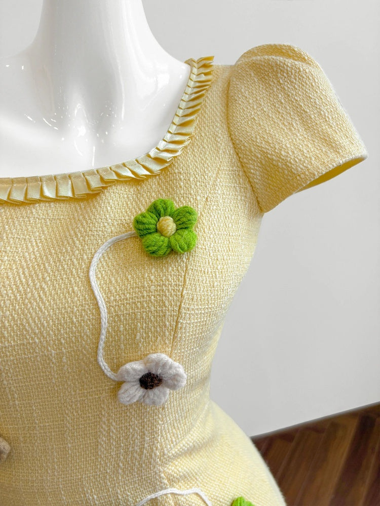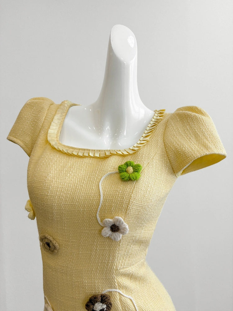 Sexy Short Sleeve Sheath Yellow Maxi Skirt Romantic 3D Floral Square Neck Long Dress AP4056