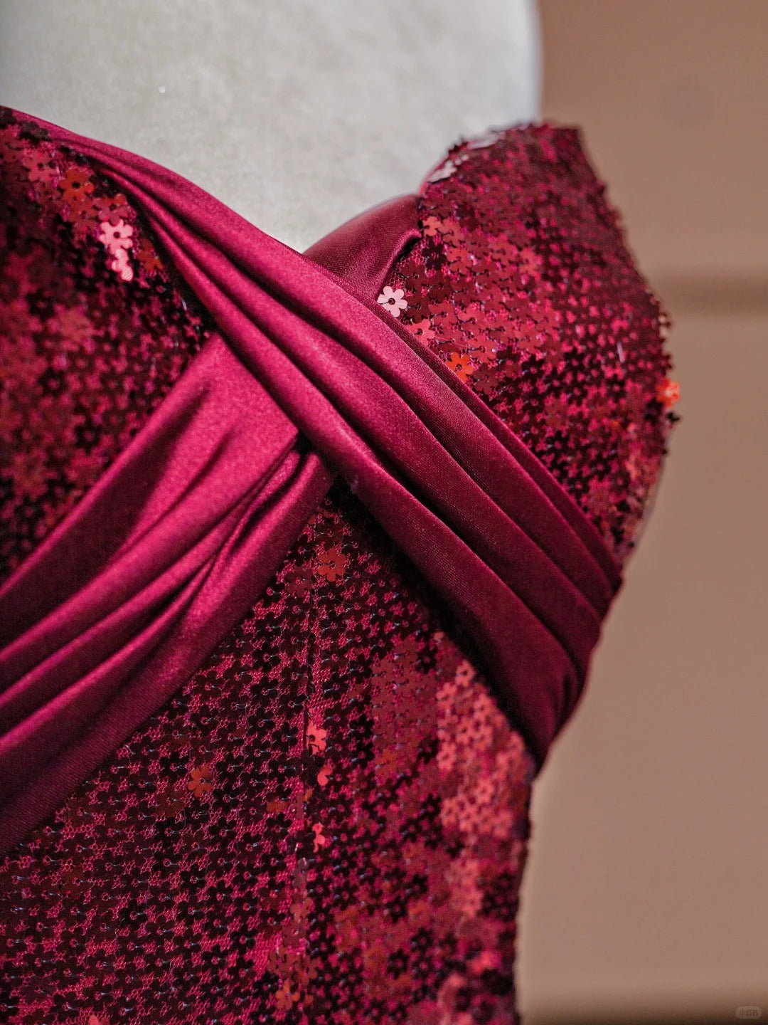Simple A-Line Strapless Red Evening Gowns Sequins Long Prom Dress AP2333